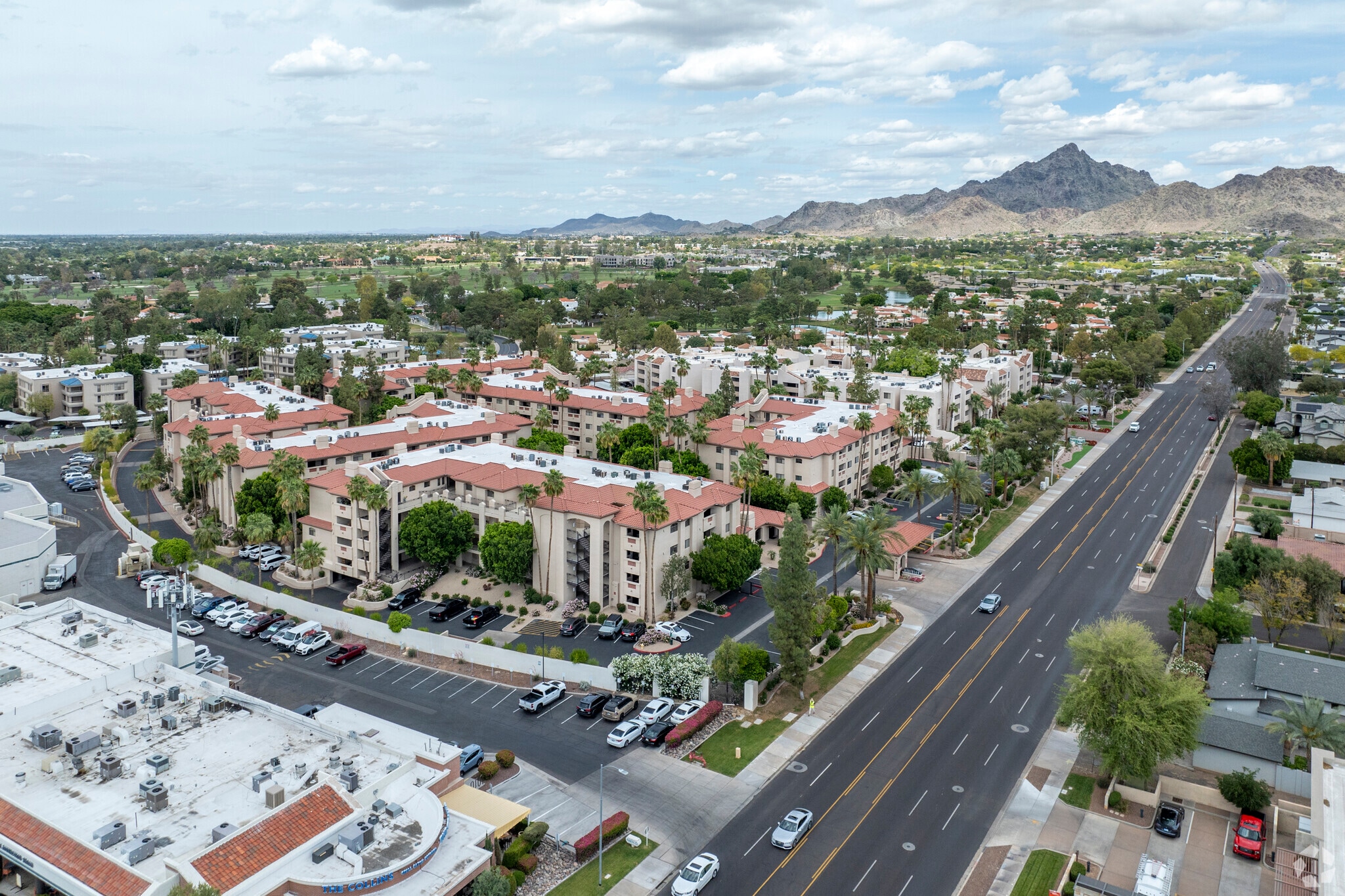 The Meridian At The Biltmore is a four-story condominium complex completed in 1990, offering a blend of modern convenience and community charm. Located in the vibrant Camelback East Village, this building houses 220 units, providing a variety of living options for those seeking a dynamic lifestyle in a sought-after area. The stucco exterior and clay tile roofing, complemented by landscaped areas with palm trees, create a welcoming atmosphere for residents.