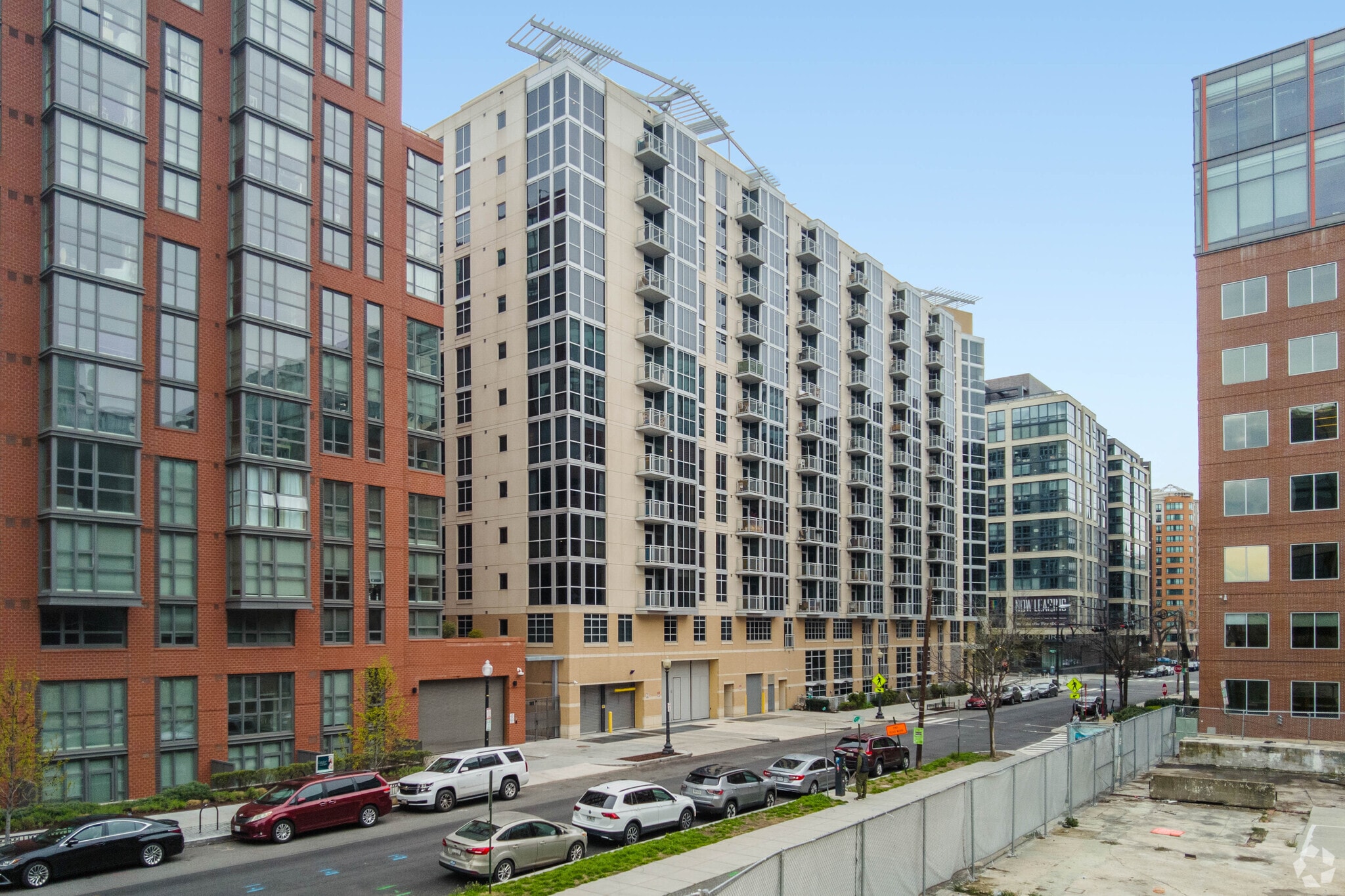 Velocity Condominiums, designed by GTM Architects, is a contemporary high-rise located in the vibrant Navy Yard neighborhood of Washington, D.C. Completed in 2009, this 14-story building houses 200 units, offering a blend of modern design and urban convenience. The building's glass and neutral-toned facade, along with its prominent corner entrance, create a striking presence in the neighborhood. The rooftop structure adds a unique architectural element, enhancing the building's skyline profile.