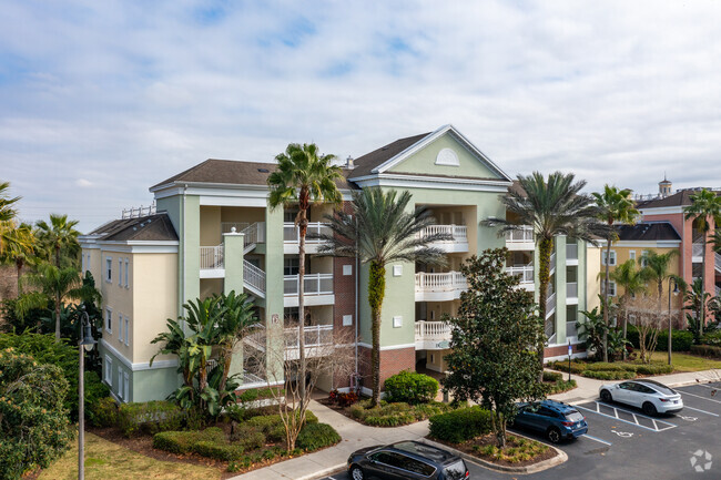 Villas at Reunion Square is a four-story condominium building located in the master-planned community of Reunion, just south of Orlando. Completed in 2006, this building features 266 units and offers a blend of modern conveniences and resort-like amenities. The symmetrical facade, hip roof, and combination of brick and stucco exterior finishes give the building a distinctive yet welcoming appearance. Multiple balconies with white railings add to the charm, providing residents with private outdoor spaces.