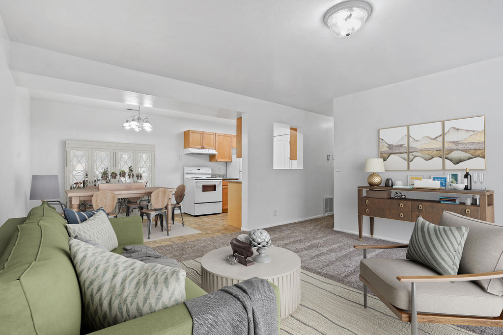 This 1200 square foot single-story residence in Midvale, Utah, offers a well-designed living space with three bedrooms and two bathrooms. The home's layout maximizes functionality, featuring a spacious primary bedroom of 210 square feet, providing ample room for relaxation and storage. The kitchen is a highlight, boasting wooden cabinetry, granite countertops, and white appliances. Its galley-style design ensures efficiency while cooking. The living area seamlessly connects to the kitchen, creating an open-concept feel ideal for entertaining. Throughout the home, neutral-toned carpeting adds warmth to the bedrooms and living spaces, while durable tile flooring graces the kitchen and bathrooms. Large windows in the bedrooms and living area allow natural light to flood the space, creating a bright and airy atmosphere. The bathrooms feature practical designs with tub/shower combinations and built-in storage shelves. The home also includes a utility room for added convenience. With its practical layout and comfortable amenities, this Midvale property offers a balanced blend of functionality and comfort, perfect for those seeking a move-in ready home in a desirable Utah location.