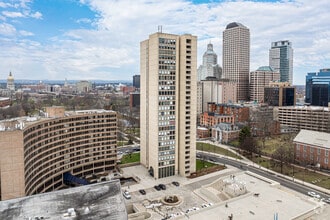 Bushnell Tower Condominiums stands as a prominent fixture in downtown Hartford, offering residents a prime location with easy access to the city's cultural and business centers. Completed in 1969 and designed by renowned architect I.M. Pei, this 27-story high-rise houses 166 units, ranging from cozy studios to spacious three-bedroom apartments. The building's simple, modern design features a predominantly rectangular shape with uniform window patterns, allowing for sweeping views of the Hartford skyline, Bushnell Park, and the Connecticut River. Its central location puts residents within walking distance of the Wadsworth Atheneum, Hartford Stage, and the bustling business district, making it an ideal home for those seeking an urban lifestyle in the heart of Connecticut's capital.