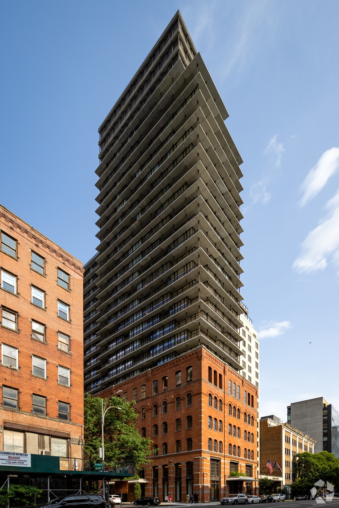 100 Vandam Street stands as a striking 25-story high-rise in the heart of Hudson Square, Manhattan. Designed by the sustainability-focused firm COOKFOX Architects, this building seamlessly blends modern luxury with historic charm. Completed in 2022, the structure houses 72 exclusive condominium units. The building's unique design features a series of staggered terraces, providing select units with private outdoor spaces and a distinctive stepped appearance. Originally built in 1888, the structure has a rich history, having served as an electric substation and a printing factory before its transformation into a residential tower. The juxtaposition of the classic redbrick façade with layers of concrete and glass, along with integrated loggia gardens, creates a visually captivating experience.