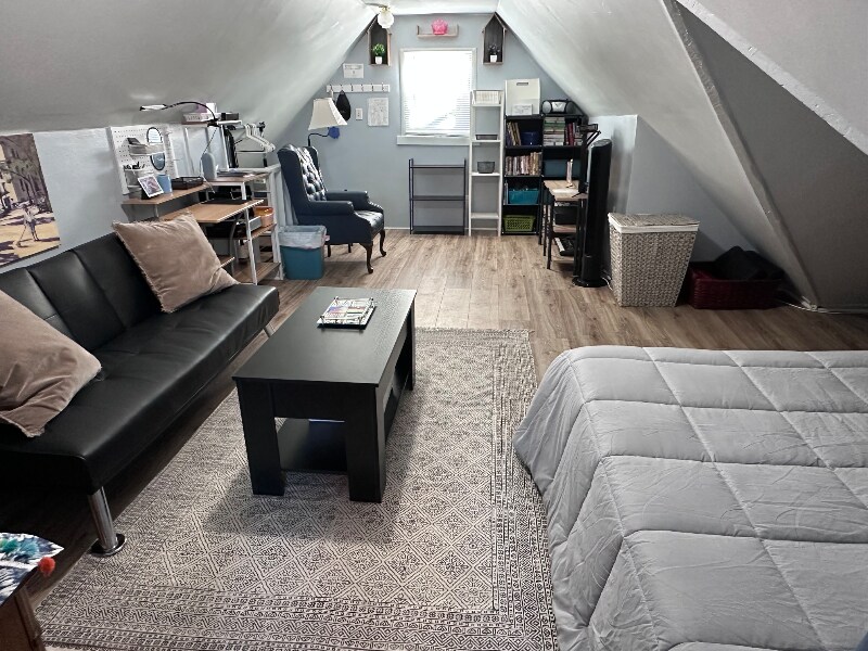 ID de la propiedad: 1077238 Loft completamente amueblado en la última planta de un dúplex. Muebles modernos, refrigerador, estufa, aire acondicionado y cama nuevos. Entrada trasera privada. Timbre con Google Home. Una cama matrimonial y un futón se convierten en cama si tiene invitados. No se admiten perros ni gatos. Incluye calefacción, agua, recolección de basura, electricidad, lavadora/secadora e internet gratuitos. Se puede añadir un garaje por un costo adicional.