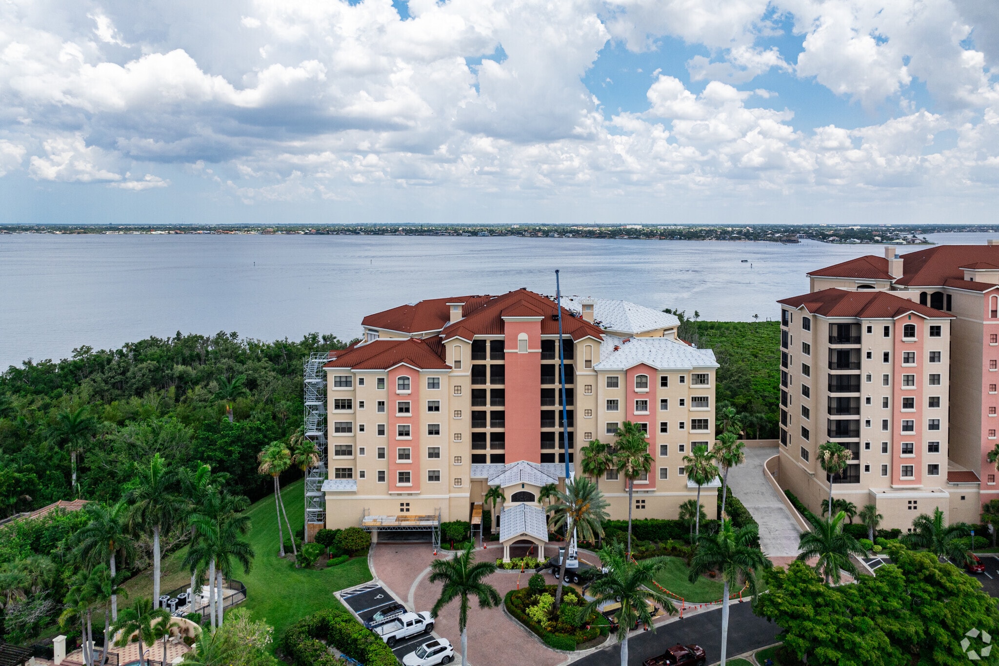 Palmas Del Sol I, an eight-story condominium completed in 1999, stands as a cornerstone of luxury living in Fort Myers' esteemed Gulf Harbour Yacht & Country Club. With 110 units, this residential tower offers expansive views of the Caloosahatchee River and the meticulously manicured golf course. The building's design, featuring a neutral color palette and symmetrical facade, complements the surrounding coastal landscape. Residents enjoy the perfect blend of exclusive community living and the natural beauty of Southwest Florida's waterfront.