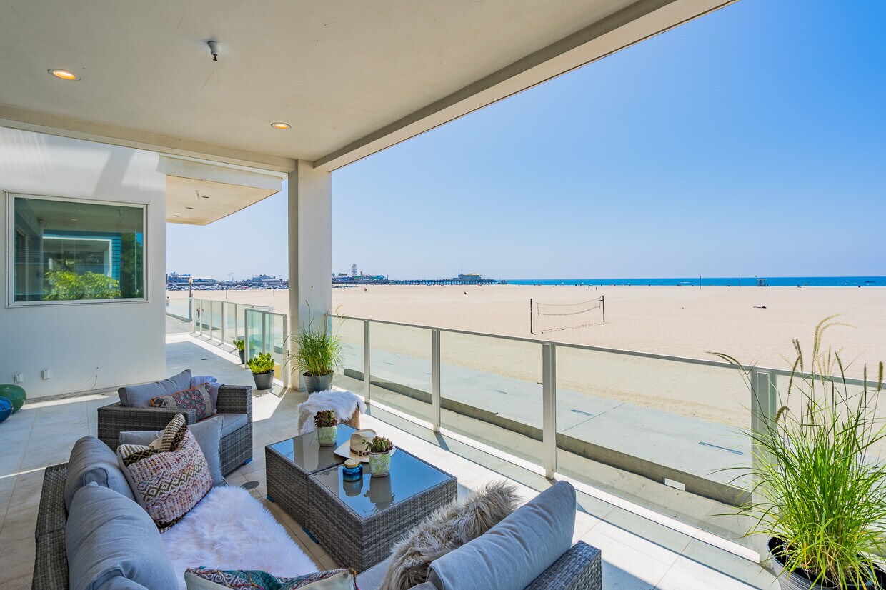 Espectacular propiedad de lujo frente al mar junto a la playa con una vista despejada del Océano Pacífico. Un condominio muy espacioso y hermoso que se siente como un hogar, todo en 1 nivel, 3 dormitorios/3,5 baños con un total de 3445 pies cuadrados de espacios habitables. Complejo privado de 3 unidades, una unidad por piso, con ascensor de acceso directo a la unidad. Techos altos, puertas corredizas de vidrio elevadas, plano de planta abierto con cocina de chef gourmet y sala familiar, comedor y sala de estar independientes con chimenea que conduce a una gran terraza frente al mar. El amplio dormitorio principal con baño cuenta con un vestidor de cedro personalizado, una sala de estar y un espacio de oficina con chimenea y una terraza con vistas al océano. La propiedad cuenta con otros 2 dormitorios con baños propios, gabinetes empotrados personalizados y cortinas personalizadas en todas partes, una sala de lavandería separada dentro de la unidad, 2 escaleras de salida, 2 estacionamientos asignados uno al lado del otro, garaje privado y edificio seguro, y más. espacios de almacenamiento. Opciones de arrendamiento flexibles, la casa está completamente amueblada y ya sea que busque una estadía a corto o largo plazo, este es un lugar perfecto a pasos de la arena, el océano, el muelle de Santa Mónica, restaurantes y tiendas. Condiciones de alquiler: Anual: $18,000 por mes