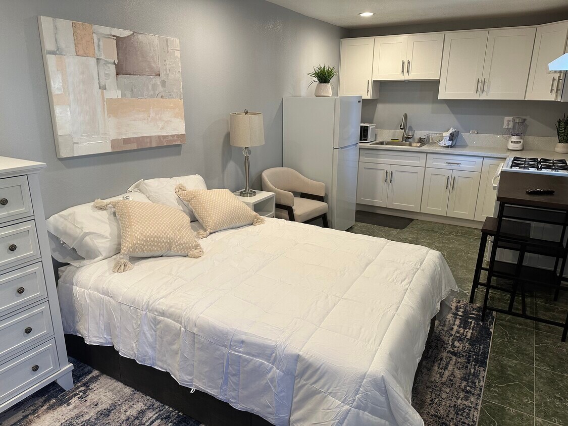 Estudio adosado con entrada independiente y privada. Todo nuevo, incluyendo encimeras de granito, pisos de madera y un excelente vecindario. Patio cubierto nuevo. Con Smart TV Samsung, mesa de comedor, lavadora y secadora nuevas... ¡Un lugar ideal para vivir! Totalmente amueblado, incluye cama matrimonial nueva, baño privado completo, armario, estufa nueva, ollas y sartenes, vajilla, cristalería, cubiertos, microondas, licuadora y patio privado.