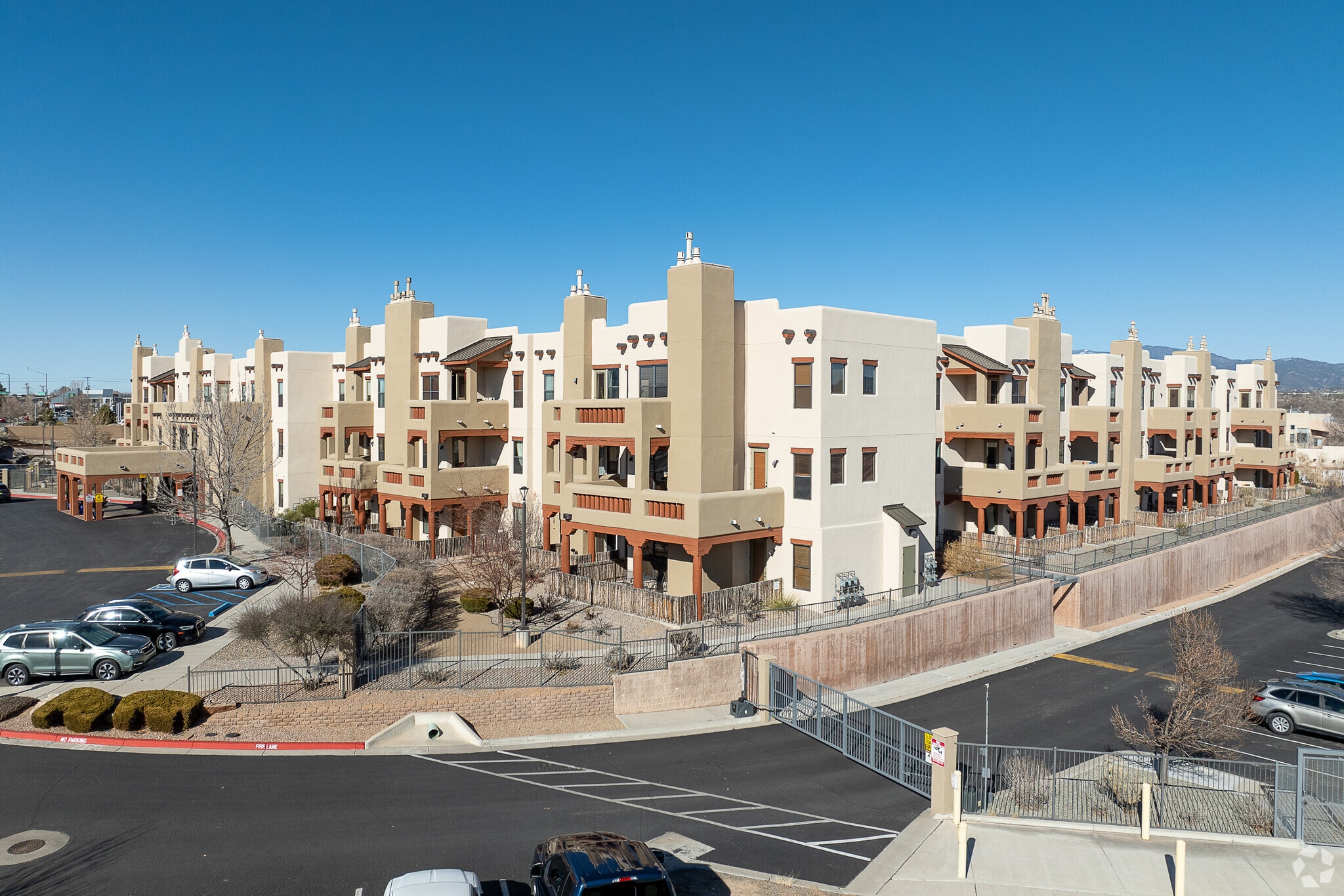 The Alameda Santa Fe Condominiums, completed in 2007, offer a blend of Southwestern style and modern comfort. This 3-story complex houses 149 units, embodying the distinctive Pueblo Revival architectural style that Santa Fe is known for. Located in a convenient area of Santa Fe, the Alameda provides residents with a serene retreat while keeping them connected to the vibrant culture and amenities of New Mexico's capital city. The building's design, with its characteristic rounded edges and stucco walls, pays homage to the region's rich architectural heritage.