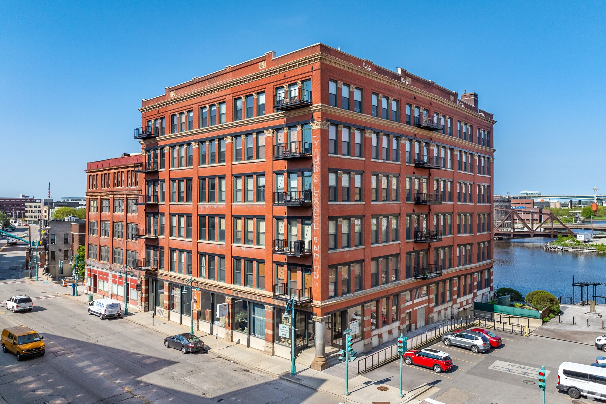 Riverwalk Plaza, a six-story condominium building, stands as a testament to Milwaukee's rich history and vibrant present. Constructed in 1894, this building features a distinctive red brick facade and large windows that allow natural light to flood the interiors. Located in the heart of the Historic Third Ward, Riverwalk Plaza offers 51 unique condo units. The building's corner location and modest decorative cornice add to its charm, while ground-level retail spaces contribute to the lively atmosphere of the neighborhood.