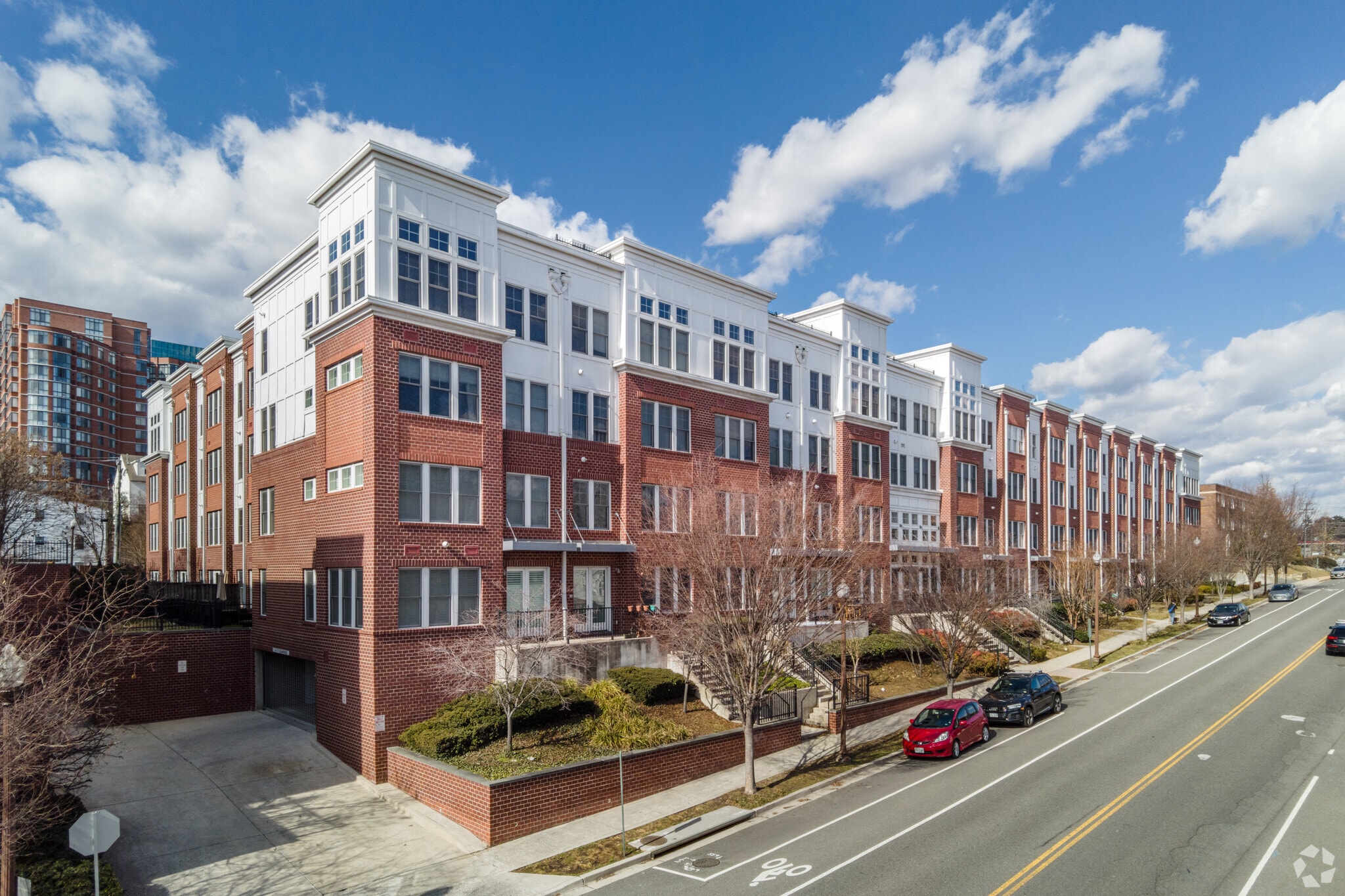 Rhodes Hill Square, completed in 2010, stands as a contemporary addition to Arlington's vibrant Clarendon-Courthouse neighborhood. This four-story condominium complex houses 180 units, offering residents a blend of urban convenience and comfortable living. Situated less than 5 miles from downtown Washington D.C., the building provides easy access to the bustling city life while maintaining a sense of community within its walls. The structure's brick facade with white trim around windows and corners presents a classic yet modern aesthetic, fitting seamlessly into the surrounding urban landscape.