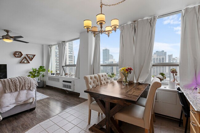 Disfrute de impresionantes vistas de la ciudad desde este condominio de 1 dormitorio y estudio, renovado y ubicado en un piso alto en Sandburg Village, con una ubicación ideal en la intersección de Gold Coast, Old Town y Lincoln Park. Este luminoso apartamento cuenta con pisos de madera noble, una amplia sala de estar con comedor independiente, una cocina abierta con encimeras de granito, electrodomésticos de acero inoxidable y barra de desayuno. El dormitorio incluye estanterías empotradas y un amplio armario, mientras que el baño renovado y las múltiples opciones de almacenamiento le brindan comodidad para el día a día. El estudio adicional es ideal como oficina en casa o rincón de lectura. El edificio, con todas las comodidades y que admite mascotas, ofrece portero las 24 horas, lavandería, solárium, gimnasio, 2 piscinas olímpicas al aire libre, canchas de tenis, estacionamiento para bicicletas, administración en el lugar y estacionamiento en garaje disponible para alquilar. Calefacción, cable, internet y agua están incluidos. A solo unos pasos de la orilla del lago, parques, transporte público, tiendas y restaurantes.