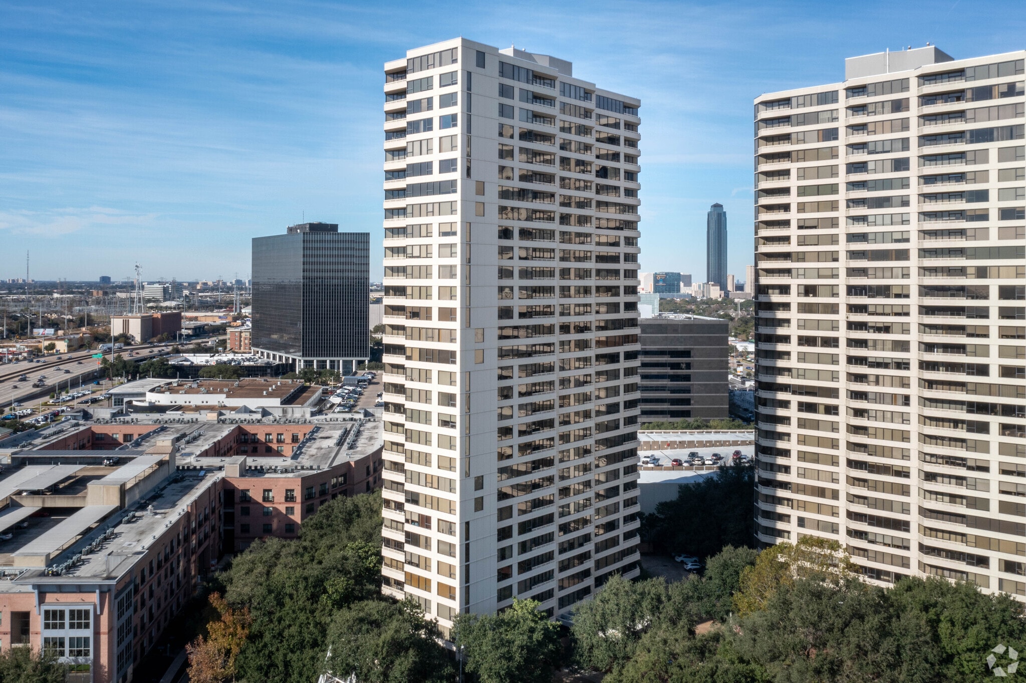 The Greenway, a 30-story high-rise condominium completed in 1980, stands as a prominent fixture in Houston's Greenway-Upper Kirby neighborhood. With 189 units, this residential tower offers a variety of living spaces for those seeking an urban lifestyle. The building's simple, modern design features a grid-like pattern of balconies and windows, creating a distinctive silhouette against the Houston skyline. Situated in a highly sought-after area known for its blend of residential charm and commercial vibrancy, The Greenway provides residents with a central location to experience the best of what the city has to offer.