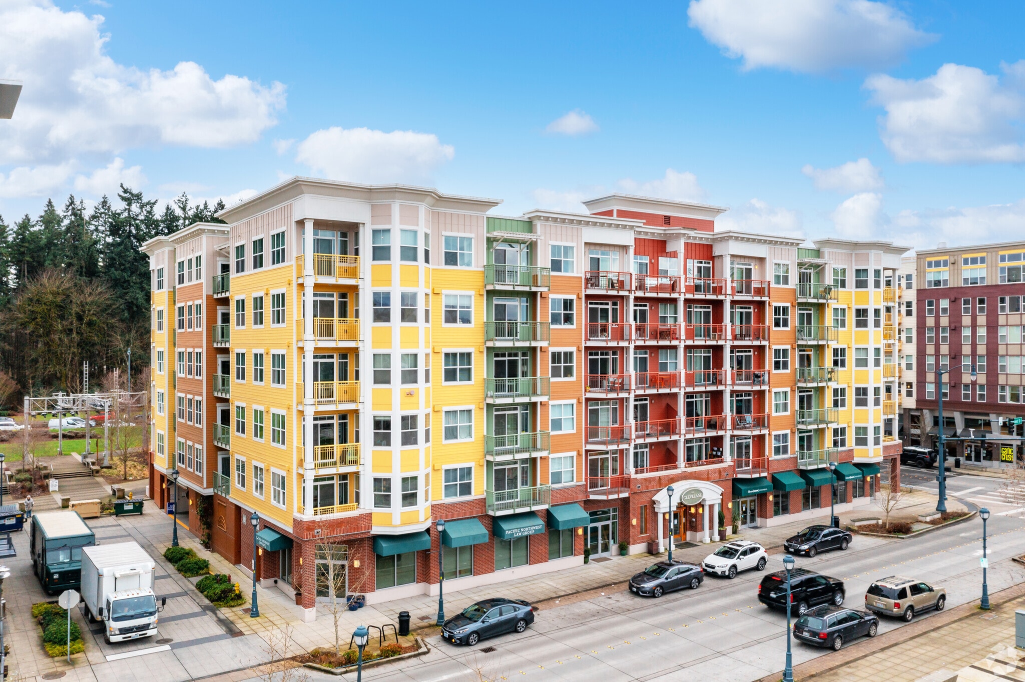 The Cleveland Condominiums, a six-story building completed in 2006, is located in the vibrant Downtown Redmond area. With 84 units, this condominium offers a blend of contemporary design and urban convenience. The building's multi-colored facade, featuring a mix of red brickwork on the ground floor and various shades of siding above, adds a touch of character to the neighborhood. Many units come with balconies, providing residents with their own outdoor space to enjoy the views of the surrounding area.