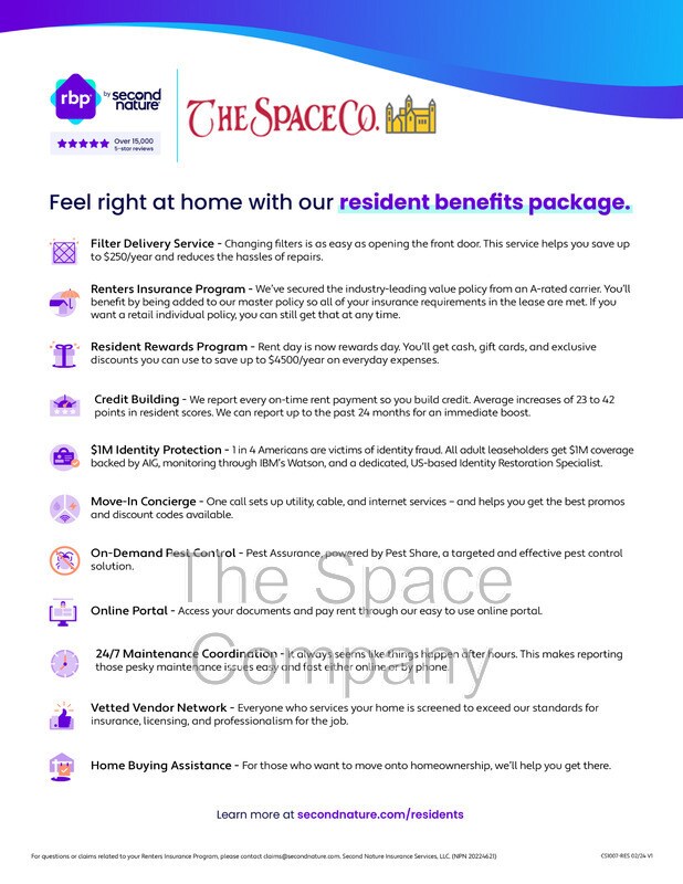 Para solicitar una visita, haga clic en "Alquileres" en nuestro sitio web y seleccione "Programar" para programar una visita a cualquiera de nuestras propiedades. **UNA VEZ PAGADA LA CUOTA DE SOLICITUD, EL DINERO NO ES REEMBOLSABLE. SIN EXCEPCIONES** Tenga en cuenta que si su solicitud es aprobada: Debe pagar el depósito de seguridad completo una vez aprobada. Una vez recibido el depósito de seguridad, la propiedad se retirará del mercado de alquiler y el contrato de arrendamiento deberá comenzar dentro de dos semanas. Si un solicitante aprobado no paga todo el monto adeudado, no firma el contrato de arrendamiento ni ocupa la propiedad según lo acordado, perderá el depósito. En The Space Company, nos esforzamos por brindar una experiencia rentable y conveniente. Por eso, ofrecemos un Paquete de Beneficios para Residentes (RBP) para solucionar los problemas más comunes de nuestros residentes. Nuestro programa cubre seguros, control de plagas, cambio de filtros de aire, instalación de servicios públicos, generación de crédito y más por $55.95 al mes, que se agregan a cada propiedad como programa obligatorio. Más detalles al solicitar. Pago mensual total: $805.95