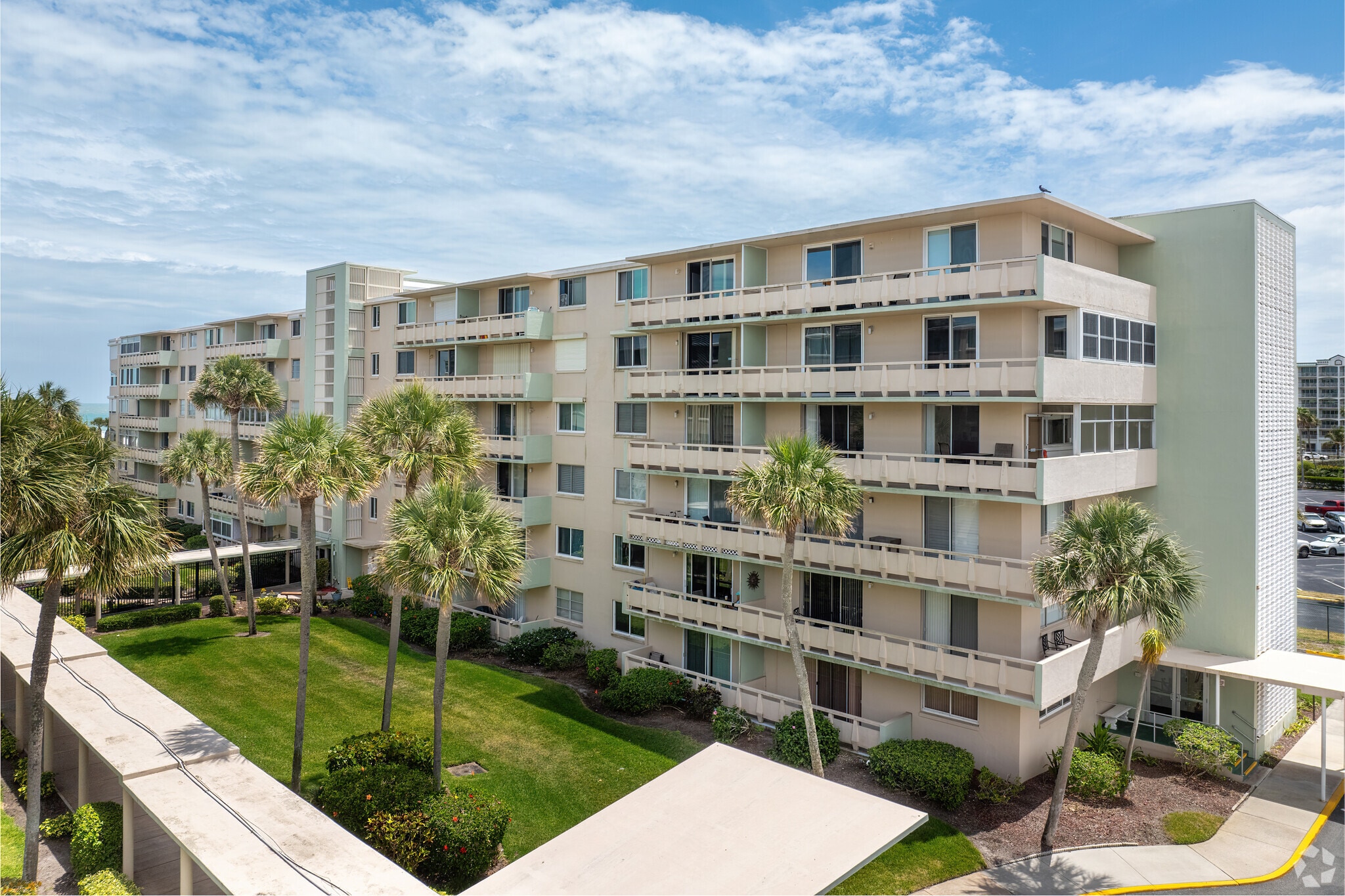 Twin Towers, constructed in 1964, stands as a prominent oceanfront condominium complex in Cocoa Beach, Florida. The six-story building houses 192 units, offering residents a prime location along the picturesque coastline. With its simple, modern design, Twin Towers provides a comfortable living experience that blends coastal charm with convenient amenities. The complex spans across well-maintained grounds, creating a serene environment for residents to enjoy the Florida sunshine and ocean breezes.