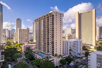 The Four Paddles, a 25-story condominium tower completed in 1974, stands as a testament to Waikiki's enduring appeal. With 250 units, this high-rise offers residents a prime location in the heart of Honolulu's most famous neighborhood. The building's simple, modern design features a rectangular shape with a grid-like pattern of balconies, blending seamlessly into the Waikiki skyline. Situated just blocks from the world-renowned Waikiki Beach, The Four Paddles provides easy access to the area's vibrant shopping, dining, and entertainment scene while offering a comfortable retreat from the bustling tourist activity.