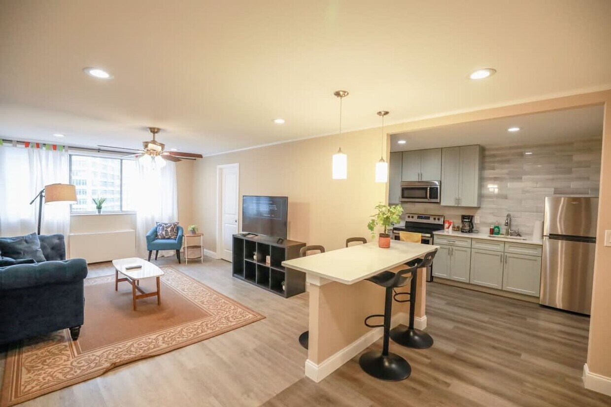 Bienvenido a su refugio en el centro de Atlanta. Este espacioso condominio de 2 dormitorios y 1 baño se encuentra en el noveno piso de un edificio residencial y ofrece hermosas vistas de la ciudad desde la sala de estar y el dormitorio. Disfrute de la comodidad de contar con portero y seguridad 24/7, además de servicio de conserjería 24 horas. Siéntase como en casa en este condominio bien equipado que cuenta con una amplia sala de estar con un gran televisor Smart LED de pantalla plana y wifi gratuito en toda la propiedad. La cocina totalmente equipada incluye estufa, refrigerador, cafetera y microondas, creando un ambiente acogedor con muebles modernos. Hay estacionamiento de pago disponible en el lugar y se pueden hacer reservas a través del sitio web correspondiente. La lavandería se encuentra en el sótano del edificio. Ubicado en el corazón del centro de Atlanta, esta propiedad ofrece fácil acceso a la estación MARTA Civic Center a solo dos cuadras. Estará a poca distancia a pie de las principales atracciones como el Americas Mart, el CNN Center, el Parque Olímpico del Centenario y una variedad de restaurantes y bares locales. El edificio se encuentra actualmente en construcción, lo que podría ocasionar ruido debido a los ventiladores en el vestíbulo y los pasillos. Se recomienda a los huéspedes que tengan en cuenta que el estacionamiento es privado y podría estar en mal estado. La propiedad tiene una política de no mascotas, con una multa mínima de $500 por infringirla. El horario de silencio es de 21:00 a 9:00, y el espacio es exclusivamente para uso residencial, por lo que se prohíben las reuniones sociales o fiestas. No se permite fumar en los pasillos ni en las áreas comunes, con una multa mínima de $50 por infringirla. El aire acondicionado y la calefacción están controlados por la Asociación de Propietarios y podrían no cumplir con las preferencias de temperatura específicas durante las temporadas de transición. [SI]