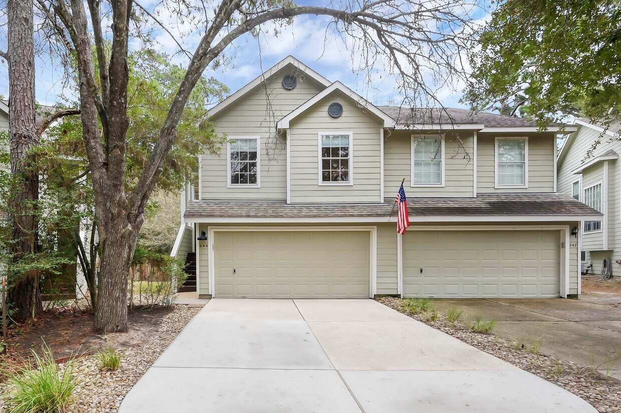 Encantadora casa adosada COMPLETAMENTE AMUEBLADA en un terreno con zona verde en el corazón de The Woodlands. ¡MANTENIMIENTO Y LIMPIEZA DE JARDÍN 1 vez al mes INCLUIDOS! Hermosa casa renovada de 3 dormitorios y 2.5 baños, luminosa y espaciosa. La entrada se abre a un acogedor vestíbulo en el segundo piso, que conduce a una sala de estar de concepto abierto. La espaciosa sala de estar cuenta con una chimenea de gas con marco de azulejos y repisa, que se integra a la perfección con la cocina con isla, barra de desayuno, cocina de gas de acero inoxidable de 5 quemadores y encimeras de cuarzo, todo abierto al comedor. Un práctico medio baño se encuentra en la planta baja. En la planta superior, la amplia suite principal ofrece un baño en suite con dos lavabos, bañera profunda, ducha a ras de suelo sin marco y un amplio armario. Dos dormitorios secundarios comparten un baño completo, y el lavadero se encuentra convenientemente ubicado en la planta superior. Disfrute de tranquilas vistas al bosque y mayor privacidad desde la amplia terraza trasera. El garaje adjunto para 2 autos incluye estanterías y armarios empotrados. Ubicación ideal cerca de tiendas, restaurantes y lugares de entretenimiento. Zonificación para excelentes escuelas del Distrito Escolar Independiente de Conroe. MLS# 13190132