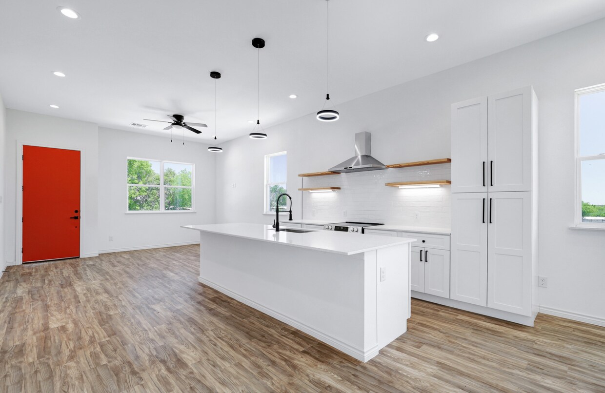 Lote en esquina de nueva construcción, 3 habitaciones con 2,5 baños, cerca de privacidad, garaje para 2 automóviles, puertas de las habitaciones de 8 pies de altura, techos altos, plano de planta abierto, accesorios de color negro mate, yeso para ducha, pisos de vinilo impermeables, vestidor principal, ventiladores de techo, amplio vestidores, tomas de televisión, gabinetes estilo shaker, isla de cocina, mostradores sólidos, patio trasero cubierto, canaletas