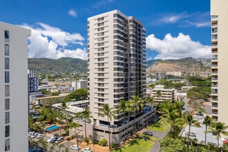 Kings Gate, a 25-story high-rise condominium completed in 1981, stands as a prominent fixture in the vibrant McCully-Mō'ili'ili neighborhood of Honolulu. With 141 units, this residential tower offers a blend of urban convenience and island living. The building's simple, modern design features a symmetrical facade with balconies, integrating seamlessly into the cityscape. Situated just minutes from downtown Honolulu and Waikiki, Kings Gate provides residents with easy access to the bustling city life while maintaining a sense of community in a neighborhood rich with history and cultural diversity.