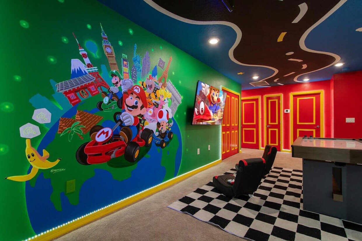 Siéntase como en casa en esta vibrante casa de 5 habitaciones y 4.5 baños en Orlando. Esta casa está diseñada para la diversión familiar y recuerdos inolvidables. Cuenta con dos habitaciones temáticas que brillan en la oscuridad: una habitación de Lilo y Stitch y una habitación de Guardianes de la Galaxia. La habitación de Lilo y Stitch cuenta con una litera con dos camas matrimoniales, y la habitación de Guardianes de la Galaxia está equipada con una litera con dos camas matrimoniales. También hay un loft de Mario Bros. con Xbox, mesa de hockey y sillas de gamer. La moderna cocina totalmente equipada y la espaciosa sala de estar y comedor son perfectos para comidas familiares y noches de cine. Disfrute de la piscina privada, la parrilla y el comedor al aire libre junto a la piscina. La calefacción de la piscina y el spa está disponible por $35 por día y es obligatoria durante toda la estadía. Se admiten hasta 2 perros por una tarifa por mascota de $150. Experimente la magia de Windsor Island Resort, uno de los complejos turísticos más nuevos de Orlando, con servicios a solo minutos de Disney. Entre las atracciones del resort se incluyen una piscina de acceso fácil, un relajante río lento, toboganes acuáticos, una zona de juegos acuáticos para niños, un bar tiki, una heladería, minigolf, baloncesto, voleibol, cornhole, un moderno gimnasio, una sala de juegos, una fogata y jardines con hamacas. Esta casa se encuentra a aproximadamente 29 km de Disney's Animal Kingdom, a aproximadamente 34 km de Walt Disney World Resort (zona de Magic Kingdom), a aproximadamente 35-40 km de EPCOT, a aproximadamente 32-40 km de Disney Hollywood Studios, a aproximadamente 40-48 km de SeaWorld Orlando, a aproximadamente 43 km de Universal Orlando Resort, a aproximadamente 56 km del Aeropuerto Internacional de Orlando (MCO) y a aproximadamente 29-30 km del Centro de Convenciones de Orlando (zona del Centro de Convenciones del Condado de Orange). Hay un importante Walmart Supercenter a aproximadamente 3 km, en la zona de Davenport. La comunidad cuenta con seguridad las 24 horas, los 7 días de la semana. Los huéspedes son responsables de rellenar el tanque de propano de la barbacoa según sea necesario durante su estancia. Mantenga a sus mascotas con correa afuera, guárdelas en una jaula si las deja solas y asegúrese de limpiar sus excrementos. Durante el invierno (del 21 de diciembre al 20 de marzo), si la temperatura exterior es demasiado baja, la calefacción de la piscina podría no alcanzar los niveles esperados. Evite usar la piscina cuando haga frío o llueva. [SI]