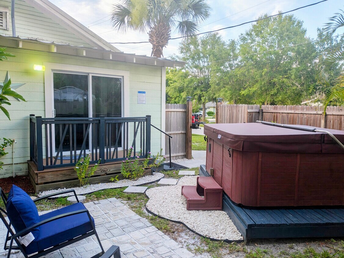Esta acogedora casa de campo se encuentra en Winter Haven, Florida. A pasos de los restaurantes del centro, las tiendas y cervecerías locales. Cerca de Legoland. Unidad para estancias cortas con cocineta pequeña. Patio cercado con spa privado. Esta casa está preparada para alquileres a corto plazo y cuenta con cocineta con microondas de convección, cafetera y vajilla completa. Lavadora y secadora, cama queen, televisores en la sala y el dormitorio. Esta unidad es un dúplex. Casa dividida de 1920.