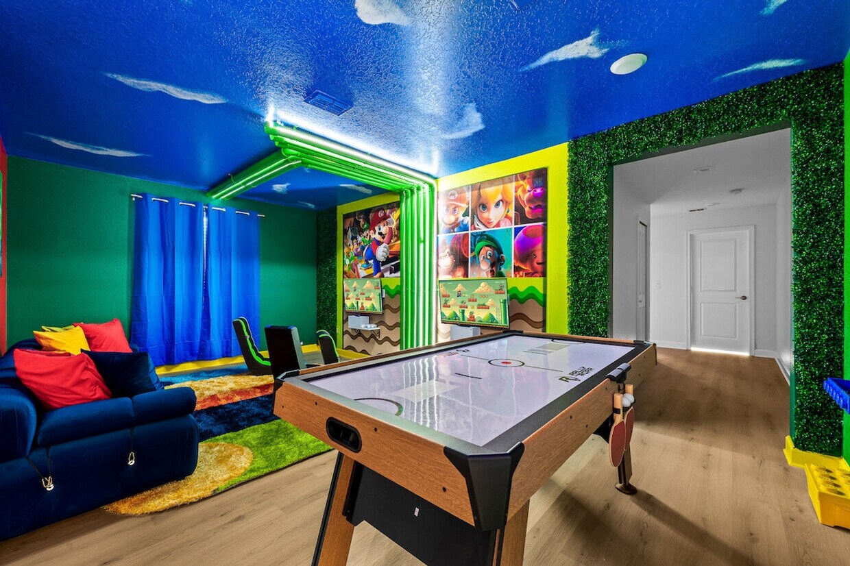 La tarifa anunciada de $10,840 al mes es la más baja disponible, basada en una estadía de 1 mes con fecha de mudanza el 5 de septiembre de 2026. Las tarifas varían según la duración de la estadía, la temporada y otros parámetros. Para conocer el precio exacto y otros componentes, visite nuestro sitio web e ingrese las fechas de entrada y salida deseadas. La tarifa se aplica al facturarse por adelantado; puede ser mayor si se factura en varios pagos. Siéntase como en casa en esta casa de Storey Lake Resort, a solo 11 kilómetros de Disney. Esta casa tiene capacidad para 18 personas y cuenta con 6 dormitorios. Este refugio familiar cuenta con una sala de cine Disney Villains con proyector 4K, sillones reclinables y sonido envolvente Dolby 5.1, y una sala de juegos de Super Mario Bros con hockey de aire, ping pong, una pared de Lego y 2 consolas Xbox 360. La cocina está totalmente equipada con electrodomésticos modernos, microondas, tostadora, licuadora, cafetera y todo lo esencial. Disfrute de la espaciosa sala de estar con un sofá seccional de lujo y un Smart TV de 75", y un comedor con capacidad para 8 personas, más 4 en la isla de la cocina. También hay lavadoras y secadoras en la unidad, y aire acondicionado y calefacción central. La piscina climatizada privada y el spa tienen calefacción por $35 al día. Se admiten hasta 2 perros (de razas aprobadas por el seguro) por una tarifa por mascota de $150. Los huéspedes son responsables de rellenar el tanque de propano de la barbacoa cuando sea necesario. Camine hasta la casa club Storey Lake, con su parque acuático y río lento. Esta casa está a minutos de Disney (12.8 km), Universal (24 km) y SeaWorld (16 km). Los huéspedes son responsables de rellenar el tanque de propano de la barbacoa cuando sea necesario durante su estancia. Mantenga a las mascotas con correa afuera, póngalas en una jaula si se quedan solas y asegúrese de limpiar sus desechos. Durante la temporada de invierno (del 21 de diciembre al 20 de marzo), si la temperatura exterior es demasiado baja, es posible que la calefacción de la piscina no alcance los niveles esperados. Se recomienda encarecidamente contratar un seguro de viaje, especialmente durante Temporada de huracanes en Florida (del 1 de junio al 30 de noviembre). Incluye un espacio de trabajo exclusivo, ideal para teletrabajo. [SI]