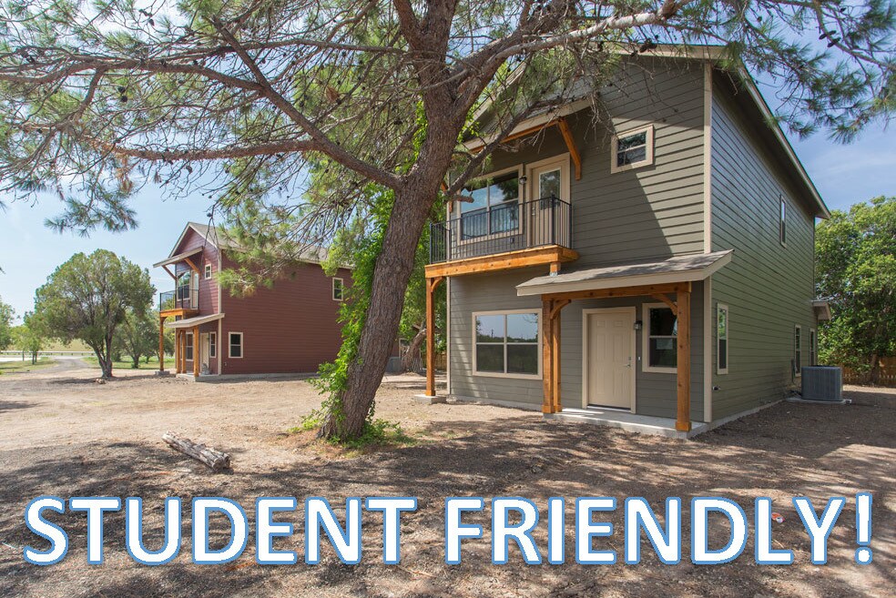 Vivienda estudiantil estilo rancho para estudiantes de la Universidad Estatal de Texas. Amplios jardines cercados. Se admiten mascotas. Amplio estacionamiento. Estanque de pesca con manantial. El alquiler incluye agua (hasta 1900 litros al mes), cuidado del césped e internet (940 Mbps de descarga). Ubicada detrás de centros comerciales de descuento.