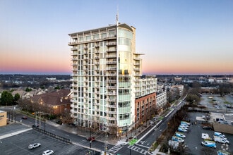 Courtside Condominiums, designed by David Furman Architecture, is a striking 16-story high-rise completed in 2006. Located in the vibrant First Ward of Uptown Charlotte, this building features a prominent curved glass facade and a distinctive spire-like feature on the roof. With 107 units, Courtside offers a blend of modern design and urban convenience, making it a notable presence in the Charlotte skyline.
