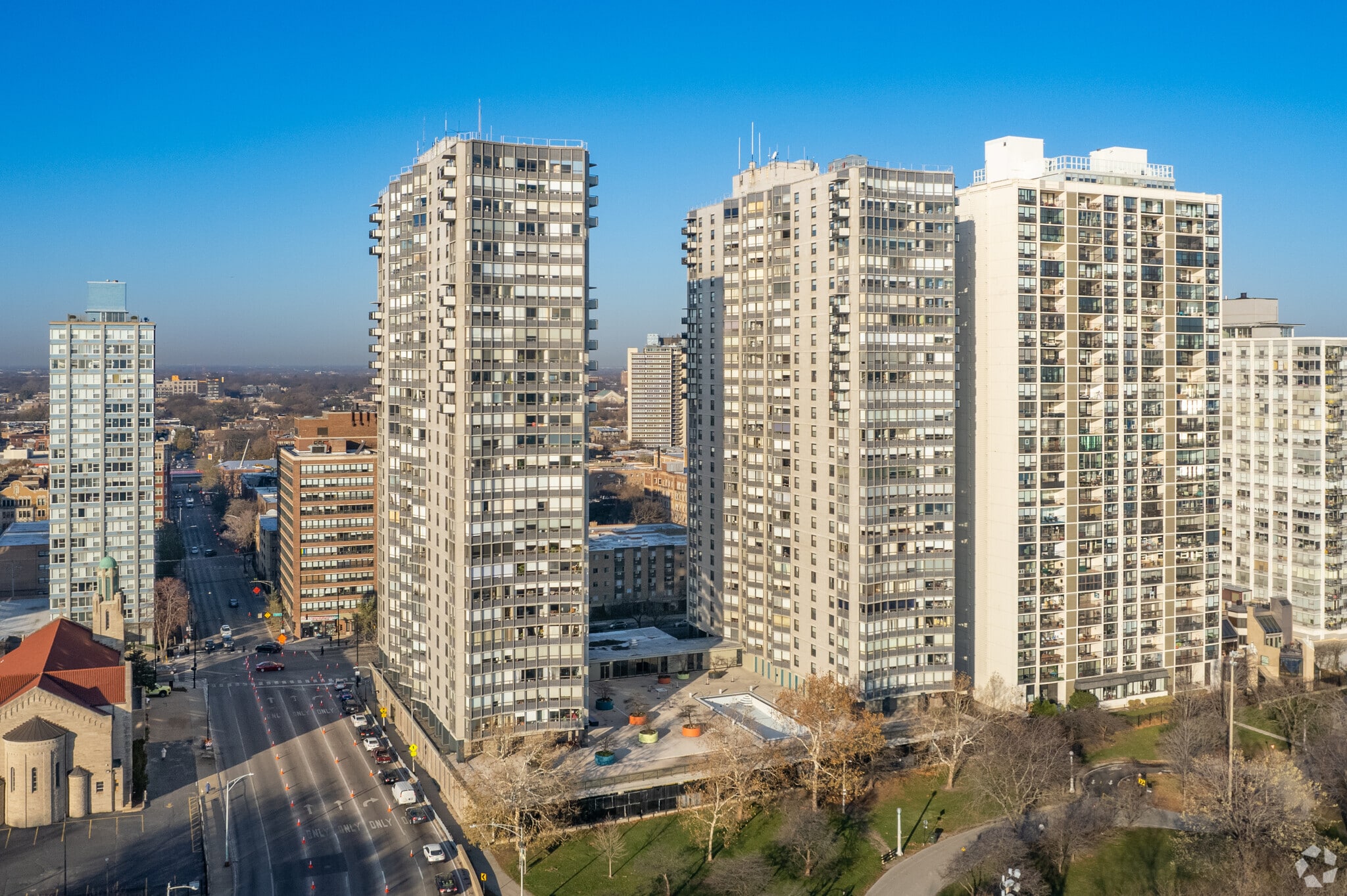 Hollywood Towers, a 30-story condominium building completed in 1963, stands prominently in the Edgewater neighborhood of Chicago. With 541 units, this high-rise offers a blend of convenience and community living. Its straightforward, utilitarian design features a grid-like pattern of windows and balconies, providing residents with stunning views of Lake Michigan and the city skyline.