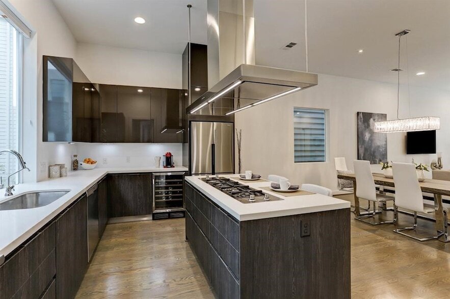 Bienvenido a esta hermosa casa de 3 dormitorios y 3,5 baños ubicada en la subdivisión de alta gama Uptown North. Ofrece un diseño moderno y elegante, está repleta de características inteligentes y hermosos pisos de roble real de 3/4" en toda la casa. En el primer nivel se encuentra el dormitorio de invitados/espacio flexible/oficina, que ofrece un baño completo y un vestidor. Además, tiene acceso a su propio espacio privado al aire libre. El segundo piso cuenta con una cocina de diseño moderno con una estufa de línea recta de 4 quemadores, enfriador de vinos empotrado, electrodomésticos de acero inoxidable, gabinetes/cajones de cierre suave y encimeras de cuarzo. El concepto abierto de la sala de estar, que fluye desde la cocina hasta el comedor y la sala de estar, crea un espacio perfecto para el entretenimiento. El dormitorio principal se encuentra en el tercer piso y cuenta con un amplio vestidor, ducha con marco y bañera separada y tocador doble. La terraza privada en la azotea se encuentra en el cuarto piso, ¡lo cual es realmente impresionante! Esta casa viene mejorada con parlantes incorporados, termostatos Nest, persianas personalizadas e interruptores inteligentes.