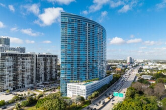 Blue, a 35-story condominium completed in 2005, stands as a prominent fixture in Miami's Edgewater skyline. Designed by the renowned Arquitectonica International Corporation, this sleek high-rise houses 330 units and offers residents breathtaking views of Biscayne Bay and the city. Located just north of the Arts and Entertainment District, Blue embodies the area's transformation into a hub of luxury living and urban convenience. The building's curved glass facade reflects its coastal surroundings, creating a striking visual presence that has become synonymous with Miami's modern architectural landscape.