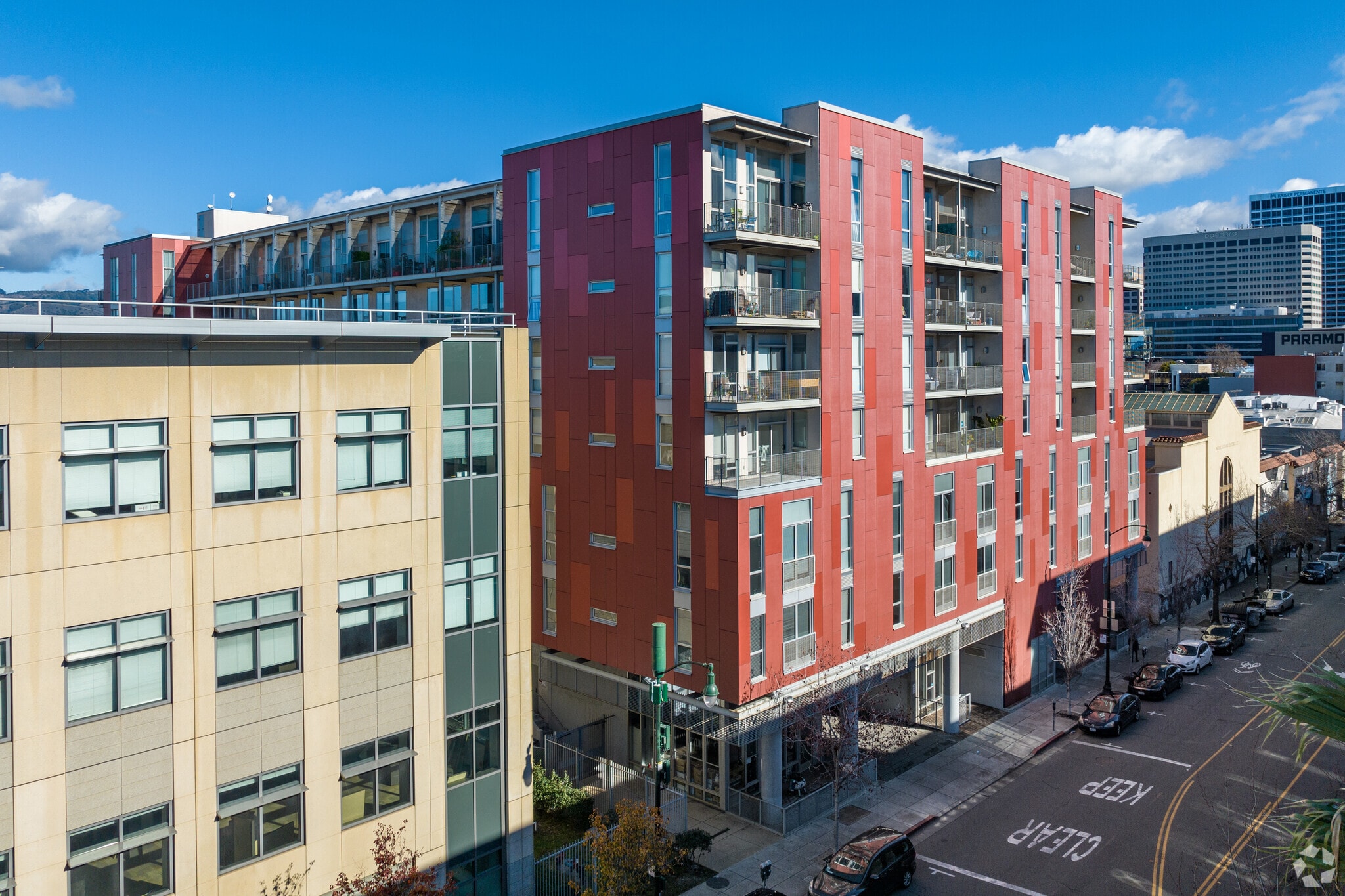 Uptown Place, completed in 2009, stands as an 8-story contemporary condominium in Oakland's vibrant Uptown neighborhood. This 88-unit building offers residents a prime location in the city's official "Arts and Culture District," surrounded by historic charm and modern amenities. The structure's clean lines and mix of red and beige facade panels with glass balconies blend seamlessly with the area's eclectic architectural landscape, providing a comfortable home base for those seeking to immerse themselves in Oakland's thriving cultural scene.