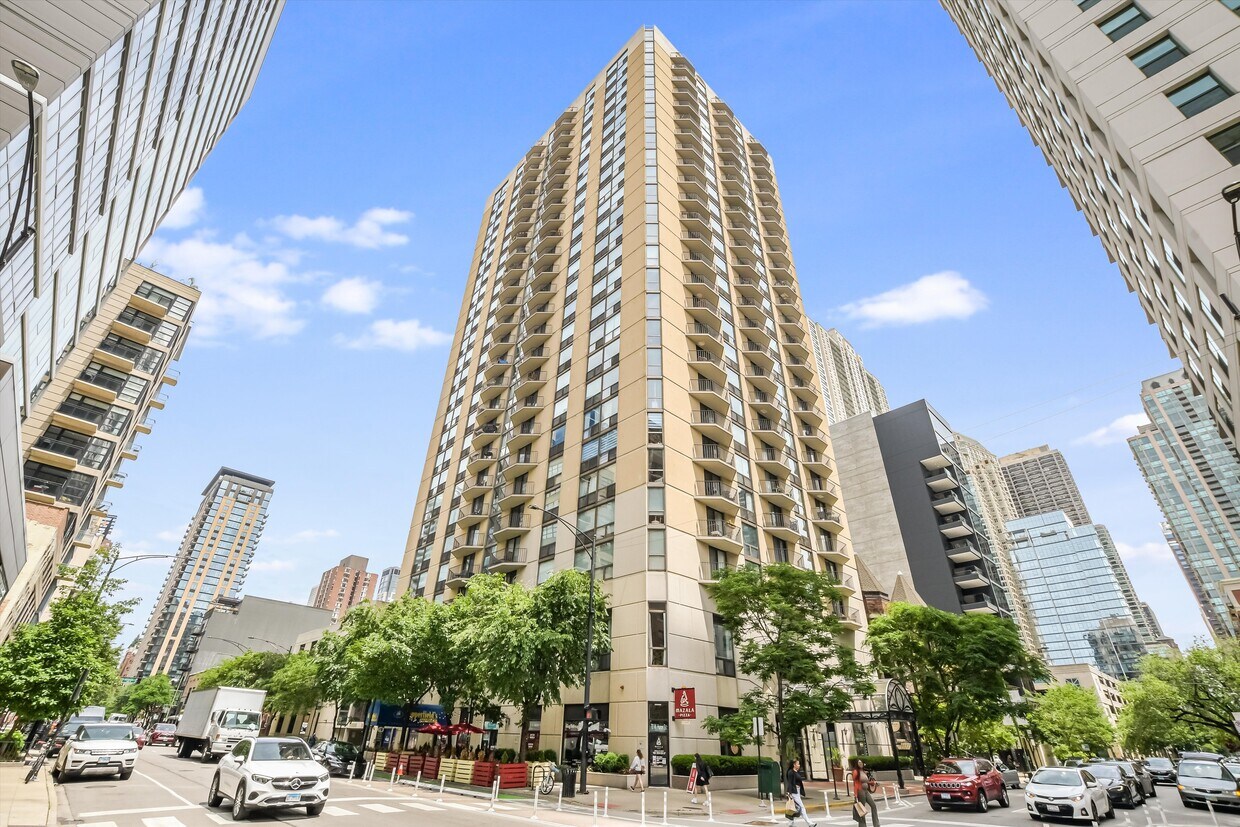 The Hermitage on Huron is a 26-story high-rise condominium located in the vibrant River North neighborhood of Chicago. Completed in 1984, this building houses 239 units and offers a blend of modern elegance and urban convenience. Its neutral facade is punctuated by a series of balconies, and the entrance is marked by a large arched canopy, welcoming residents and visitors alike.