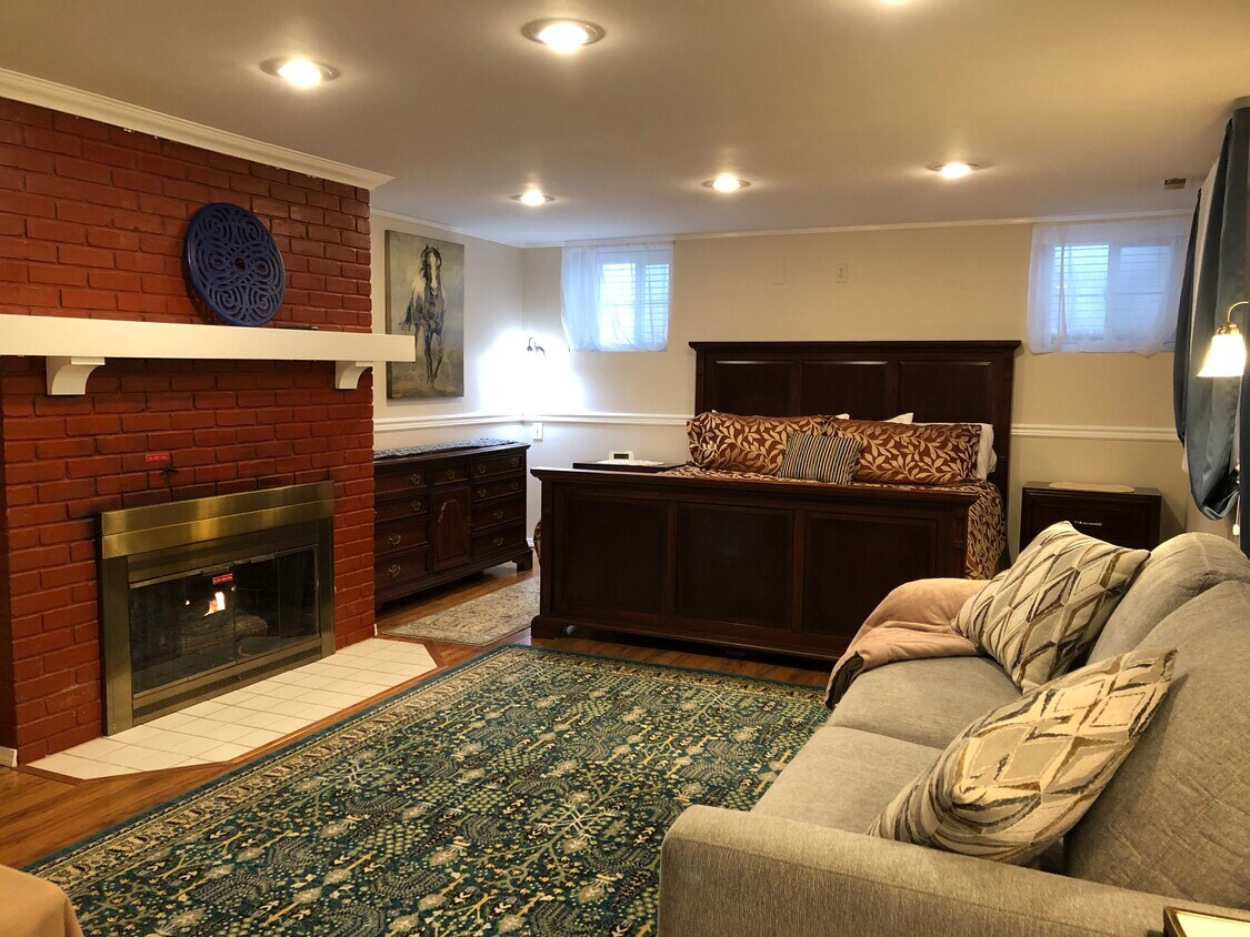 Suite amueblada para estancias cortas con cama king, sofá cama, cocina americana, televisor de pantalla plana, chimenea de gas y bañera de hidromasaje doble con ducha. La cocina americana incluye nevera, fregadero, microondas, tostadora, cafetera y placa eléctrica. Es una amplia suite en la planta baja. Esta suite está disponible para estancias de uno a varios meses. Dispone de wifi. Su ubicación es conveniente para acceder a numerosos negocios de Sunnyside y al hospital. Contáctenos si necesita alojamiento.
