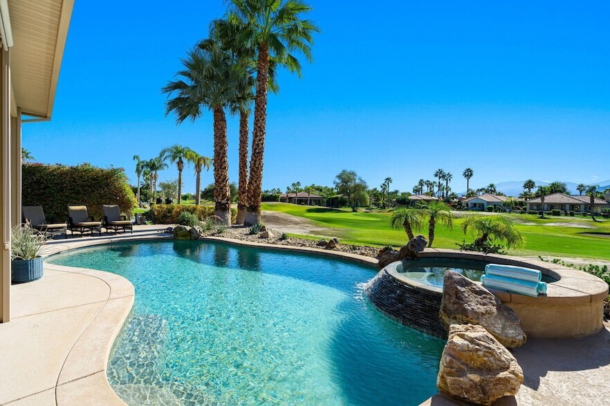 ¡Nuevo anuncio! Retiro ejecutivo en el campo de golf Mira Vista. Ubicado en el hoyo 16 del campo Gary Player Signature en Mission Hills, este impresionante refugio ejecutivo ofrece impresionantes vistas al campo de golf y a la montaña, además de una espectacular piscina privada y un spa diseñados para el lujo y la comodidad. Recientemente remodelada, la casa cuenta con tres dormitorios con baño privado, incluyendo una casita independiente con cocina americana y baño privado. El dormitorio principal y el segundo dormitorio ofrecen camas king size, mientras que el tercer dormitorio cuenta con una cama queen. Una oficina o un cuarto dormitorio opcional incluye su propio baño privado y una cama plegable queen size, lo que ofrece espacio flexible para invitados adicionales. En el interior, los altos techos crean un ambiente luminoso y luminoso en toda la casa. Elegantes suelos de baldosas con aspecto de madera, una acogedora chimenea y amplios ventanales realzan las hermosas vistas. La vida al aire libre es igual de impresionante. Relájese bajo el amplio lanai cubierto, con un cómodo sofá-sala de estar y un comedor con vistas al campo de golf. El espectacular patio delantero ofrece otro espacio privado perfecto para tomar un café o un brunch por la mañana. Esta casa se encuentra en un amplio terreno privado dentro de la comunidad vigilada de Mira Vista, rodeada de majestuosas palmeras. La cocina remodelada cuenta con encimeras de granito, una isla y un bar, lo que la hace perfecta para el entretenimiento. Los amantes del golf apreciarán el acceso de pago por juego a dos campos públicos cercanos: el Gary Player Signature Course y el Pete Dye Course, ubicados a la vuelta de la esquina en el Westin Resort and Spa. Otros clubes de campo cercanos ofrecen membresías de temporada. Disfrute de un corto viaje en auto hasta el famoso distrito comercial y gastronómico de El Paseo, la vibrante vida nocturna de Palm Springs a solo 14.5 km y el Casino Agua Caliente a solo 5 minutos. Contemple las majestuosas vistas a la montaña y al campo de golf desde la sala de estar, el comedor, la cocina y la habitación principal. No querrá irse nunca de esta hermosa casa en Vía Bella.