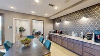 Community kitchenette con refrigerador de dos puertas, microondas, asientos y de la isla
