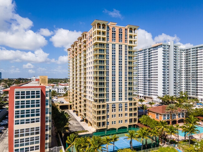 2080 S Ocean Drive, completed in 2004, stands as a 19-story condominium building in the vibrant Hallandale Beach neighborhood. With 212 units, this Mediterranean Revival-style building features ornate classical detailing around the roofline and arched windows, all set against warm, earthy tones. The building offers a blend of modern living with a touch of classical elegance, making it a distinctive presence along the coastline.