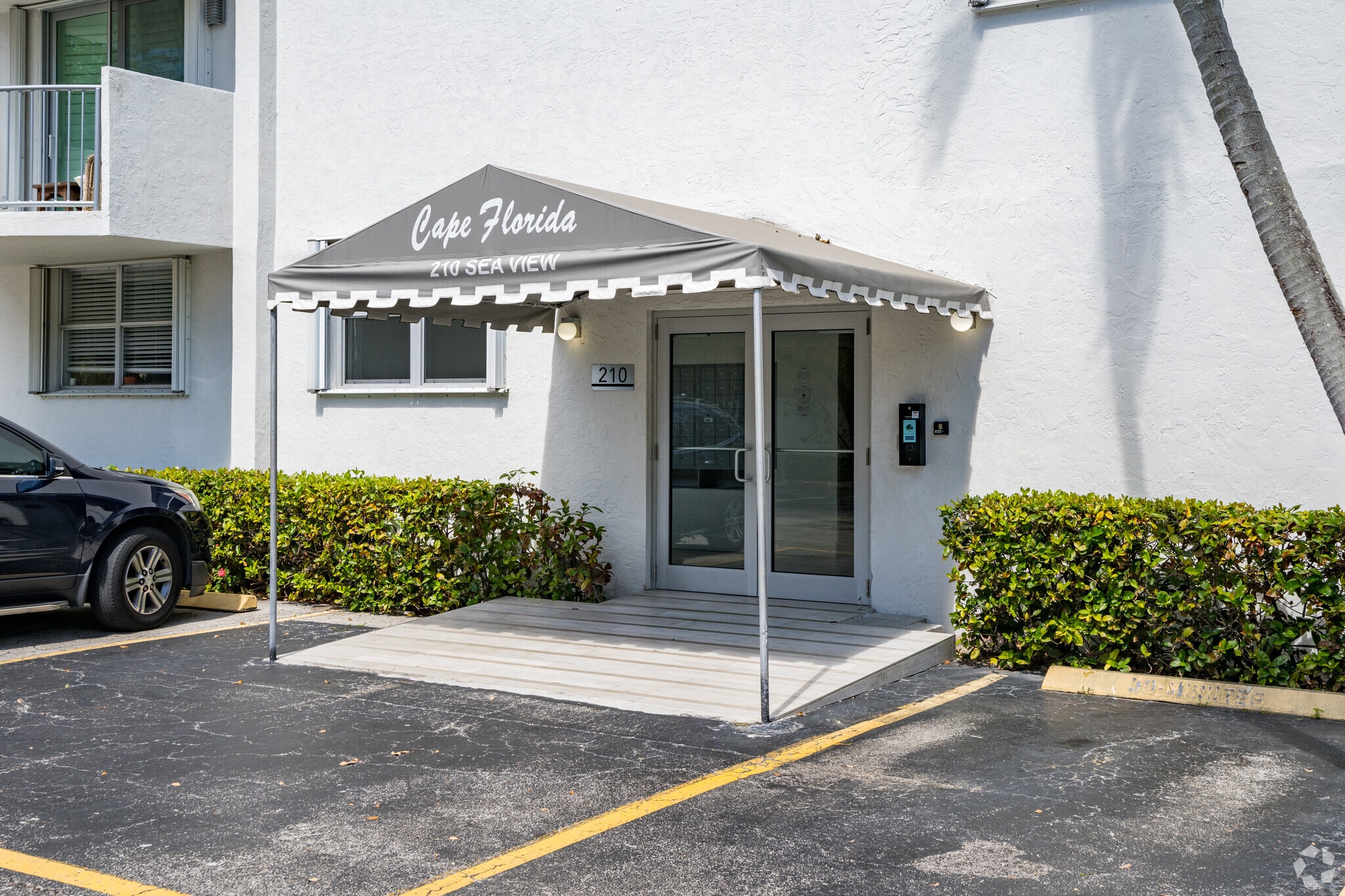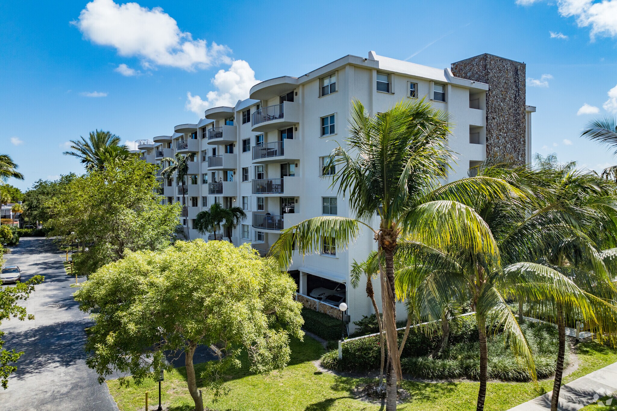 Located in the serene Village of Key Biscayne, 210 Sea View Drive offers a tranquil island lifestyle just off the coast of Miami. This six-story condominium, completed in 1972, houses 60 units and features a straightforward, modern design. The building's balconies on each level provide residents with outdoor space to enjoy the ocean breeze. The stone-clad central feature adds a touch of texture to the otherwise clean facade, blending seamlessly with the coastal surroundings.