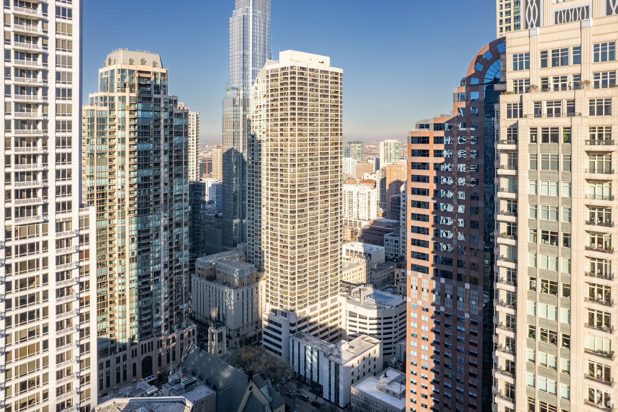 30 E Huron Street stands as a prominent fixture in Chicago's vibrant River North neighborhood. This 60-story high-rise, completed in 1978, houses 460 condominium units, offering residents a blend of urban sophistication and convenience. The building's glass facade and balconies create a rhythmic pattern on its exterior, reflecting the modern aesthetic of its surroundings. Situated just off Michigan Avenue in the Cathedral District, 30 E Huron provides easy access to the bustling energy of downtown Chicago while maintaining a sense of residential tranquility. The structure's height allows for sweeping views of the city skyline and Lake Michigan, making it a coveted address for those seeking an elevated urban living experience.