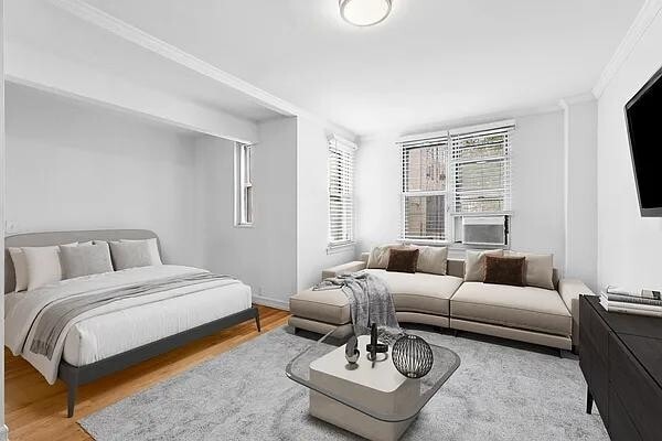 Sixty apartments across six stories range from studios to one-bedrooms. There are, however, a handful of combined units with two-plus bedrooms. Designed in 1950, the layouts are roomy, featuring multiple walk-in closets, formal foyers, sizable living rooms, galley-style kitchens and king-sized primary bedrooms. Studios, ranging from 400 to 500 square feet, are big enough to fit three distinct areas for living, dining and sleeping. Unit #1E, a gut-renovated studio with interior courtyard views, sold for $565,000 in December 2024. One-bedrooms, spanning between 550 and 750 square feet, have split floorplans with eat-in kitchens; a few bigger units have an extra alcove that can be used as an office. Apartment #6B, a one-bedroom with a renovated kitchen and bathroom, bespoke built-in closets and a wet bar with a wine fridge, sold for $975,000 in July 2024. One of the grander residences, #4JK, is a combined four-bedroom residence with three bathrooms, a kitchen that needs renovating and a laundry alcove; it sold for $2.2 million in December 2024.