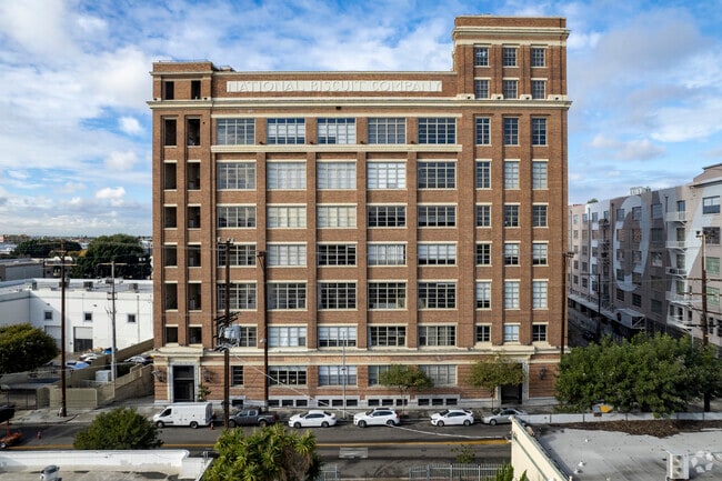 Biscuit Company Lofts, designed by architect E.J. Eckel, stands as a seven-story testament to early 20th-century industrial architecture. Completed in 1925, this building originally served as the West Coast headquarters for Nabisco. Located in the vibrant Arts District of Downtown Los Angeles, the building houses 104 unique condo units. The brick facade and large rectangular windows reflect its utilitarian roots, while the interior spaces have been thoughtfully converted to blend historical charm with modern conveniences.