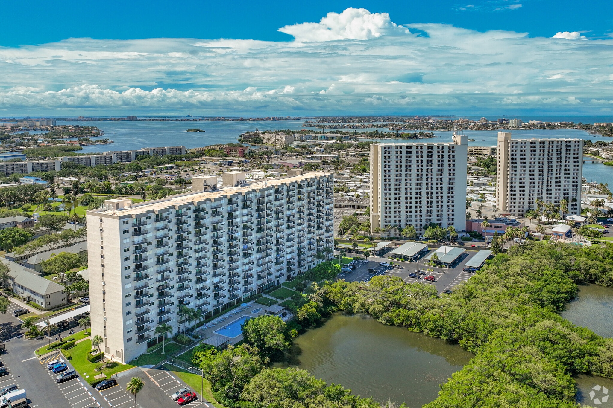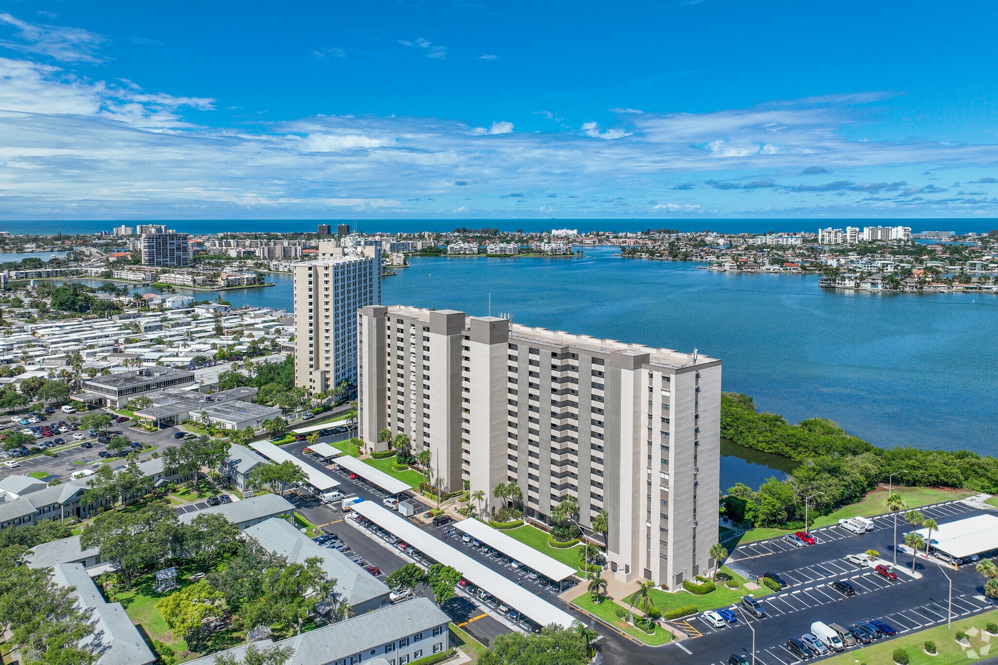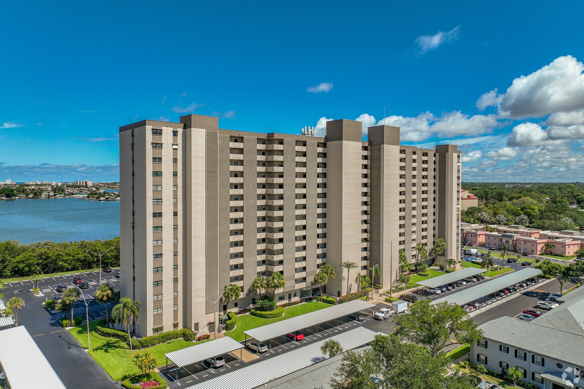 Chateau Towers, completed in 1980, stands as a prominent 15-story condominium in the heart of South Pasadena, Florida. This waterfront property houses 215 units, offering residents breathtaking views of Boca Ciega Bay and the Gulf of Mexico. The building's location provides a perfect blend of coastal living and urban convenience, situated just minutes from some of Florida's most renowned beaches and the vibrant downtown St. Petersburg area.