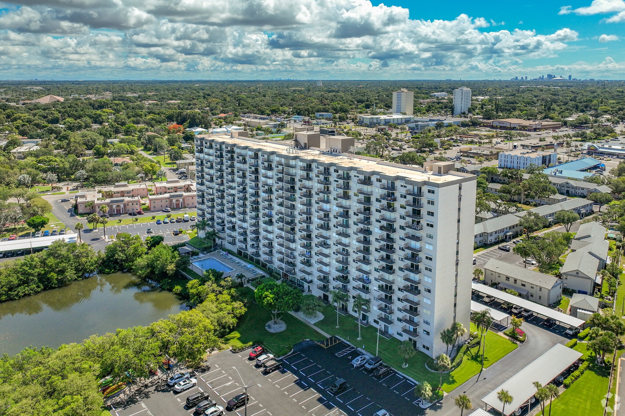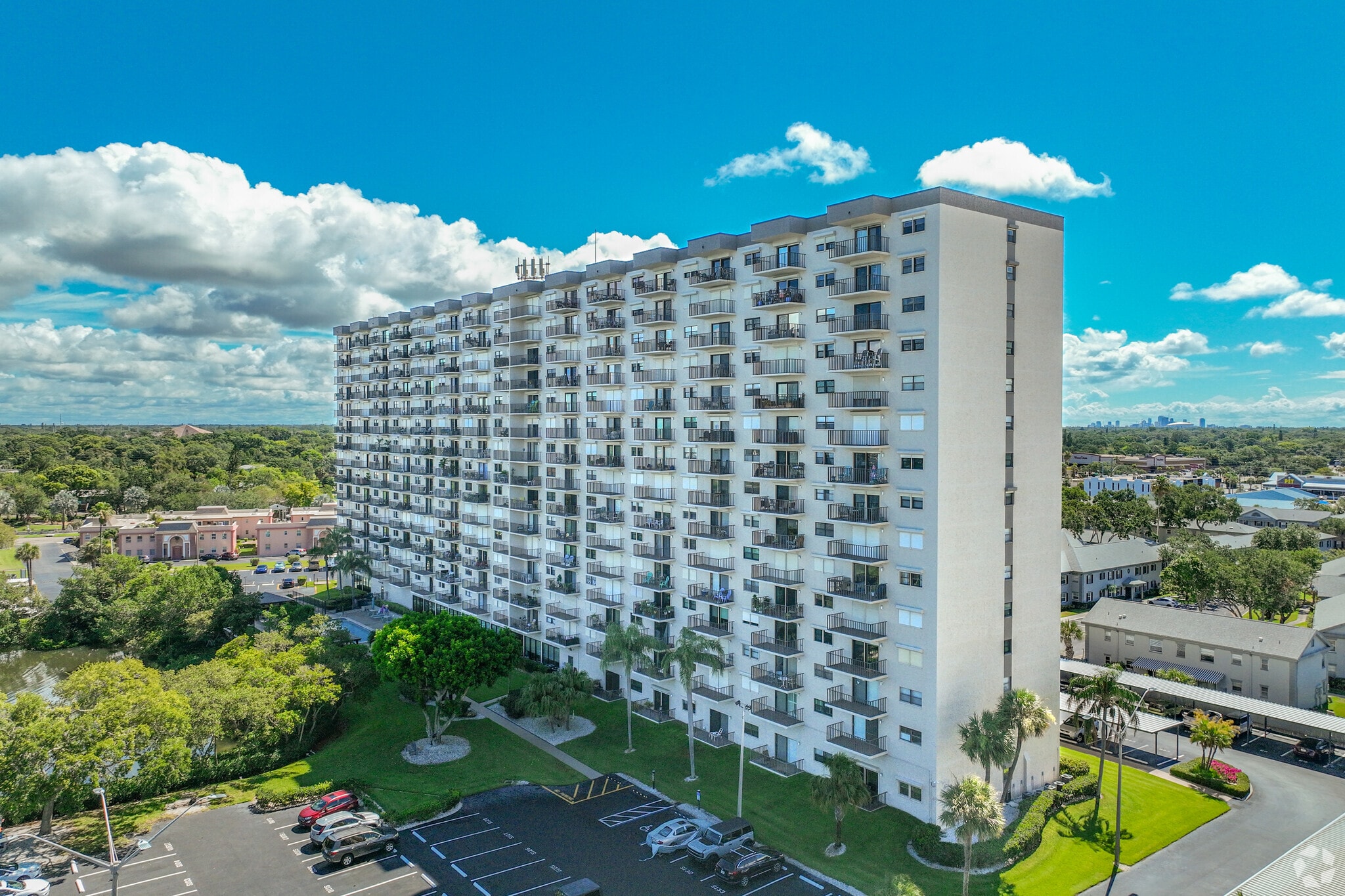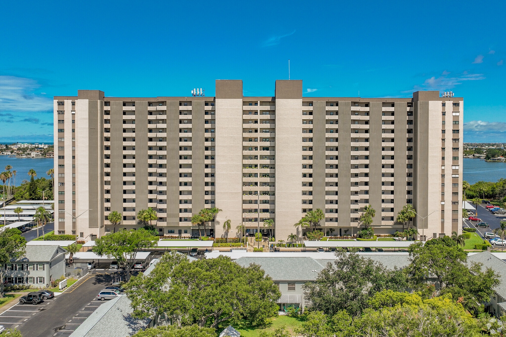 Chateau Towers, completed in 1980, stands as a prominent 15-story condominium in the heart of South Pasadena, Florida. This waterfront property houses 215 units, offering residents breathtaking views of Boca Ciega Bay and the Gulf of Mexico. The building's location provides a perfect blend of coastal living and urban convenience, situated just minutes from some of Florida's most renowned beaches and the vibrant downtown St. Petersburg area.