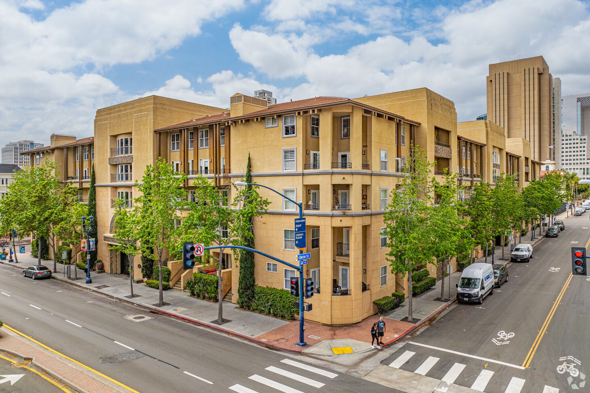 City Walk, a modern condominium complex in downtown San Diego's Marina District, offers a blend of urban sophistication and coastal charm. Completed in 2003, this 4-story development houses 109 residences, ranging from cozy one-bedroom units to spacious three-bedroom homes. The building's design, while not adhering to a specific architectural style, features a stucco facade with rounded corners and symmetrical balconies, creating a distinctive presence in the neighborhood. City Walk's prime location, just steps away from the waterfront and vibrant city attractions, makes it an ideal choice for those seeking a dynamic downtown lifestyle.