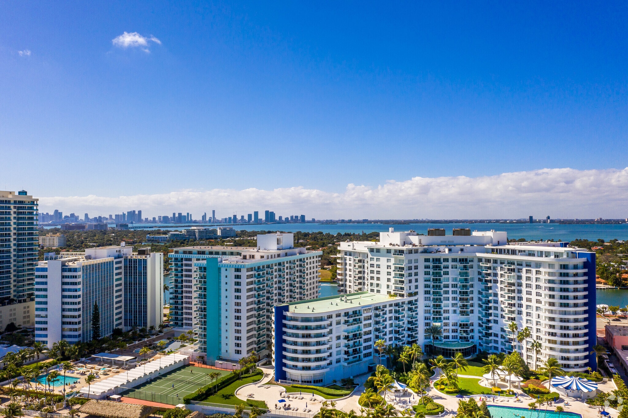 Copabella, a 24-story oceanfront condominium completed in 1995, stands as a prominent fixture on Miami Beach's prestigious Millionaire's Row. With 84 exclusive residences, this modern high-rise offers panoramic views of the Atlantic Ocean, Biscayne Bay, and the iconic Miami skyline. The building's curved facade and wraparound balconies maximize these vistas, providing residents with an immersive coastal living experience.