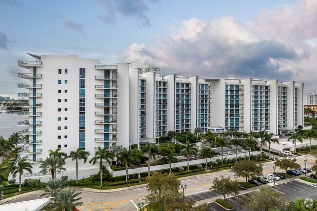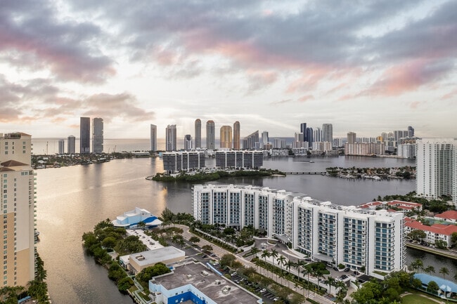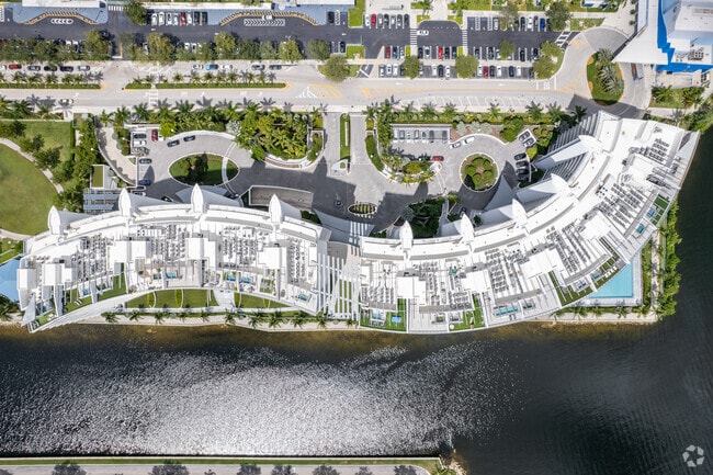 Echo Aventura, designed by Cohen Freedman & Encinosa Architects, stands as a prominent fixture in Aventura's skyline. Completed in 2015, this 11-story condominium offers 190 luxury residences with stunning views of the Intracoastal Waterway and city skyline. Located at the end of 188th Street, Echo Aventura provides a private waterfront retreat while remaining close to the vibrant amenities of the city. The building's contemporary design features a curved facade with prominent balconies, creating a sleek silhouette against the Florida sky.