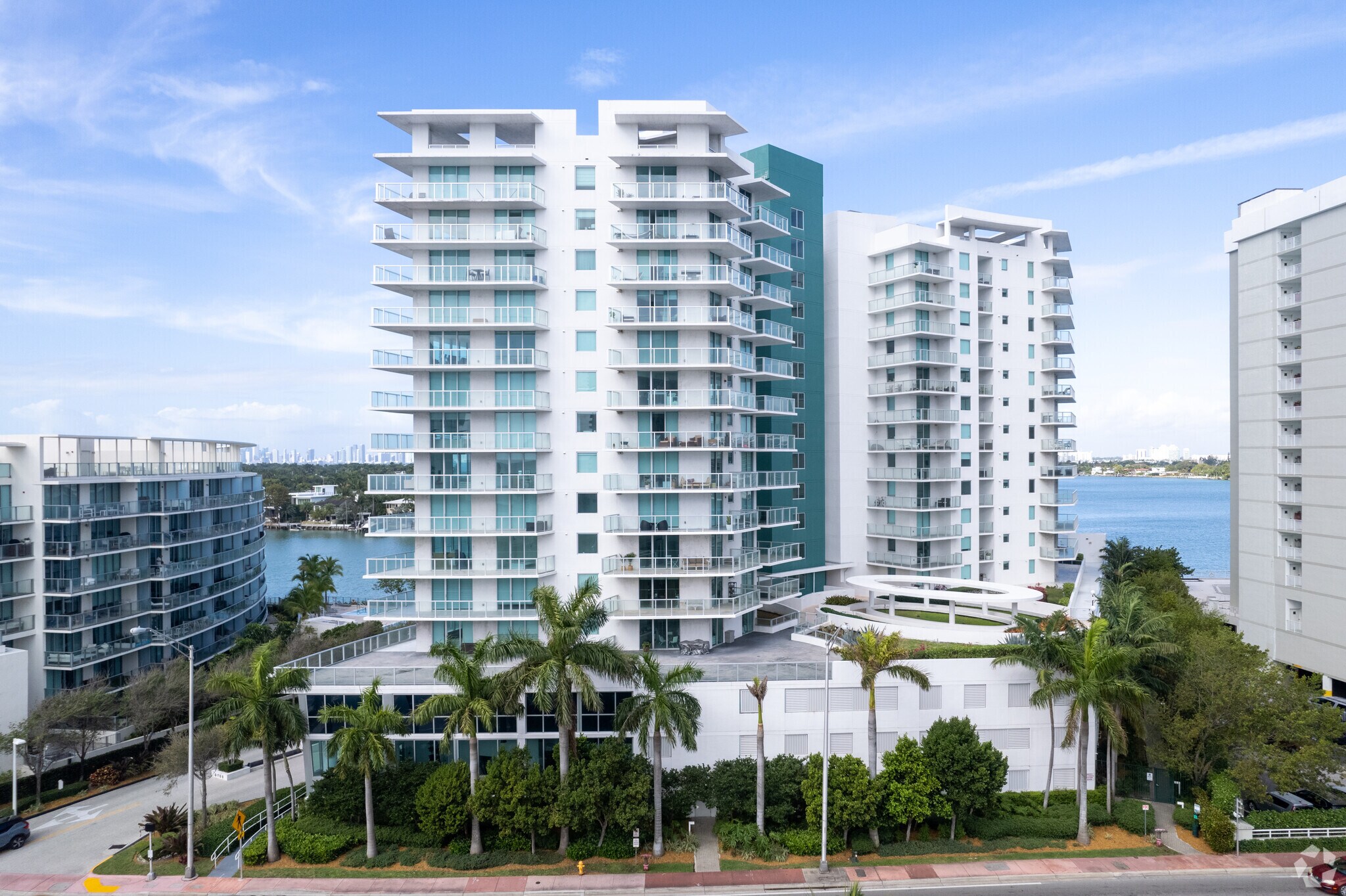 Eden House, a 16-story condominium designed by Kobi Karp Architecture, stands as a modern addition to Miami Beach's North Shore neighborhood. Completed in 2013, this boutique building houses 100 units, offering residents a prime location just steps from the beach. The sleek structure features a clean design with balconies on each floor, complemented by a striking vertical blue element that breaks up the white facade. Situated between the ocean and Biscayne Bay, Eden House provides residents with panoramic views of the surrounding waters and cityscape.