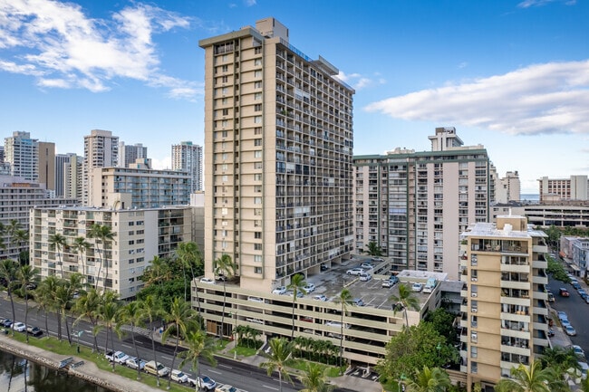 Fairway Villa is a 28-story condominium building located in the vibrant Waikiki neighborhood. Completed in 1974, this high-rise offers 362 units, providing a range of living options from studios to four-bedroom layouts. The building's location along the Ala Wai Canal offers residents easy access to the best of Waikiki, including its famous beaches, shopping, and dining. The building's simple, modern design with a grid-like facade and balconies ensures a functional and comfortable living environment.