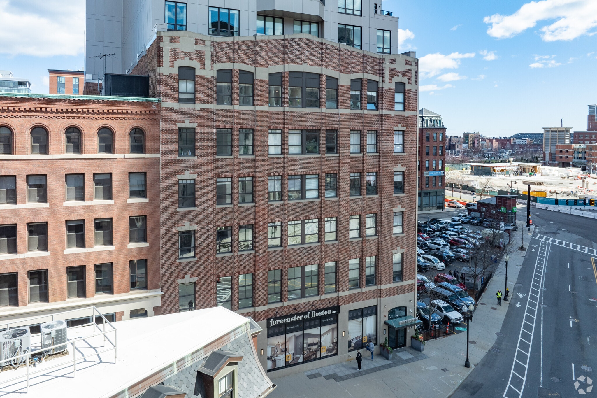 Forecaster 121 is a contemporary condominium building located in the Bulfinch Triangle Historic District of Boston. Completed in 2017, this 10-story structure houses 80 units, offering a blend of modern amenities and historic charm. The building's utilitarian design features a flat facade and minimal ornamentation, fitting seamlessly into the vibrant and historically rich area.