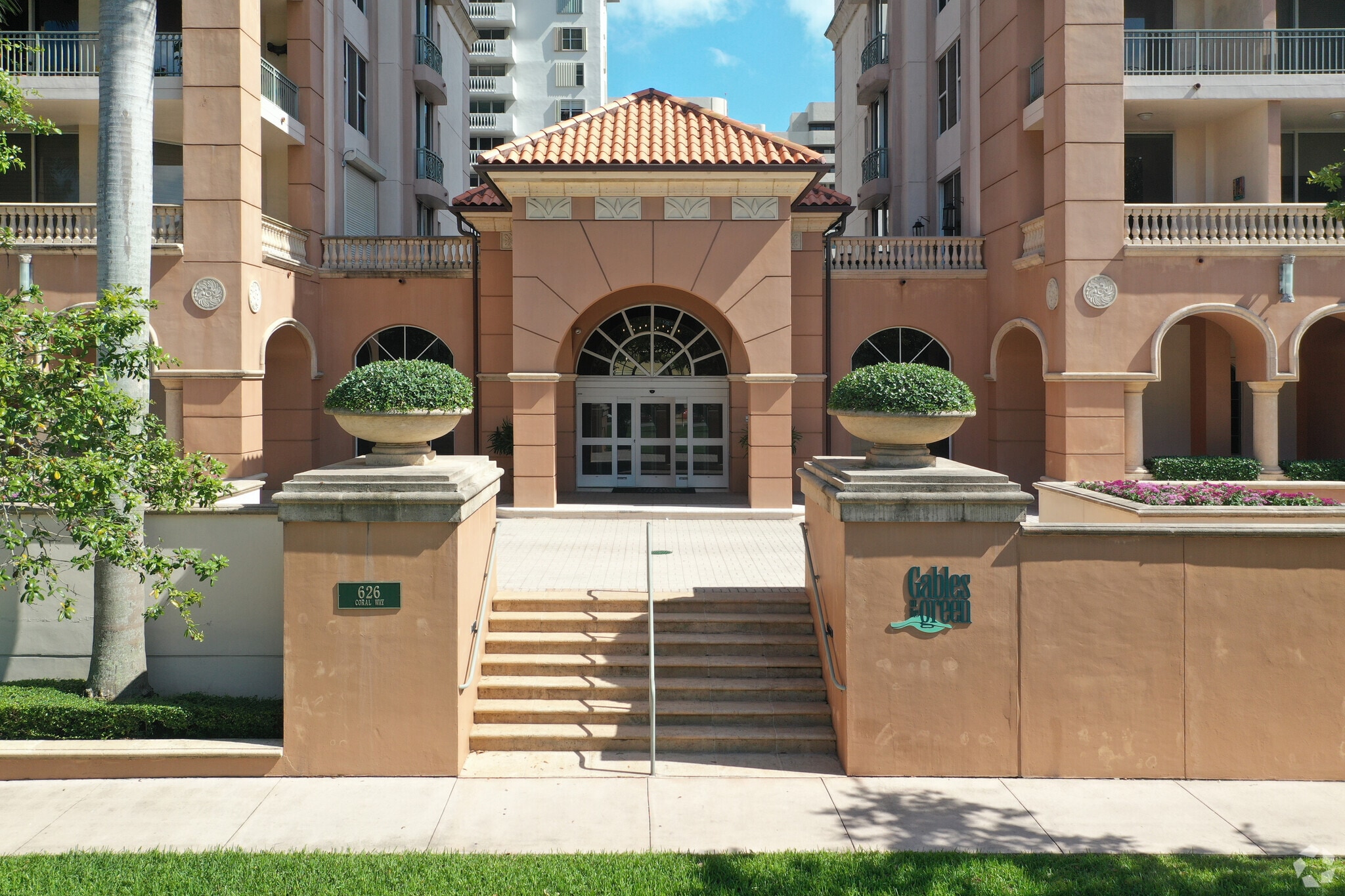 Gables on the Green, designed by Fullerton Diaz Architects Inc., stands as a 16-story testament to the Mediterranean Revival style. Completed in 2002, this condominium features 53 units and is located in the heart of Central Coral Gables. The building's symmetrical facades, arched windows, terracotta roof tiles, and ornate detailing around the entrances and cornices evoke a sense of timeless elegance. Residents enjoy a blend of historical charm and modern convenience, with floor-to-ceiling windows offering sweeping views of the Granada Golf Course, downtown Coral Gables, and beyond.